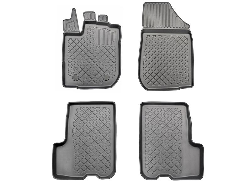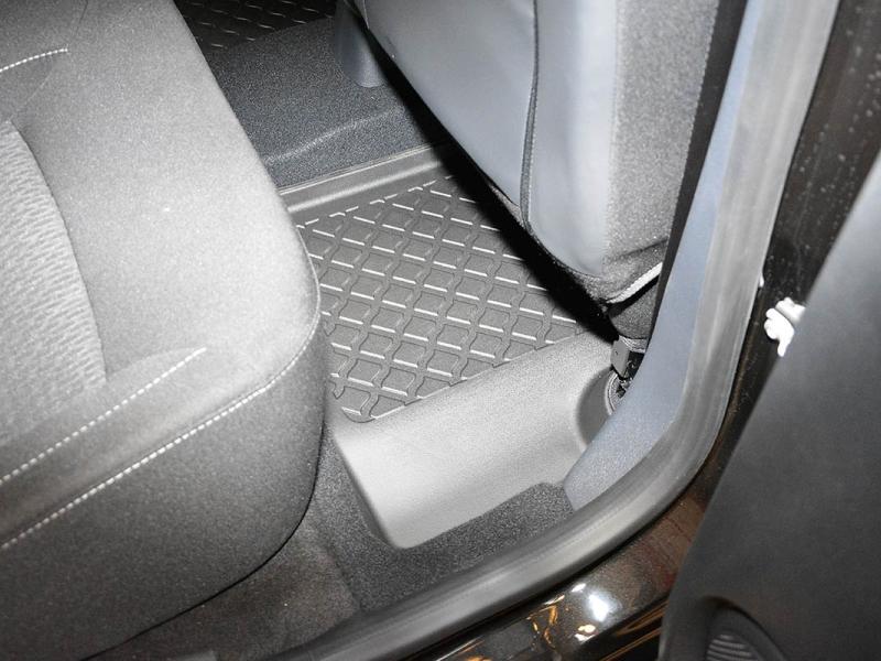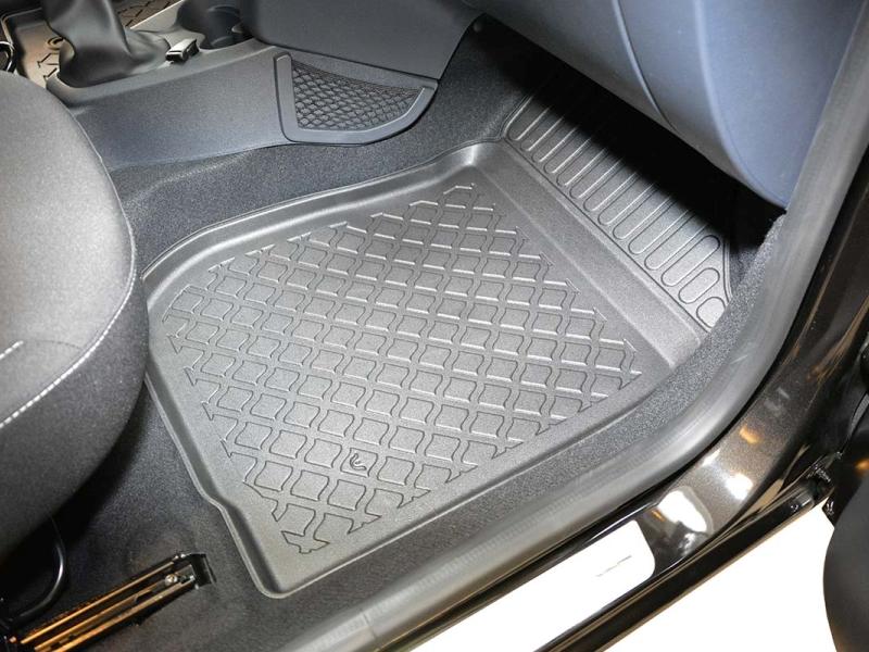 Gumoplastové 3D přesné podlahové koberce ve tvaru vaničky pod nohy pasažérů na vůz Dacia Logan II MCV, 5 dveří rok výroby 09.2013 - 12.2020, od polské firmy Aristar, které zabraňují namočení koberců interiéru od mokrých bot nebo bot od sněhu a jsou vyrobené ze stejného materiálu jako vany do kufru od stejnojmenné firmy.