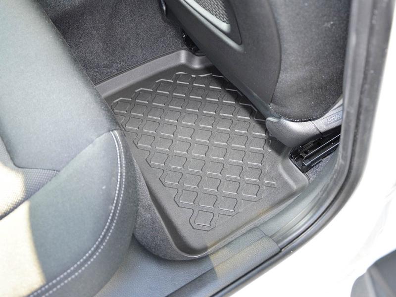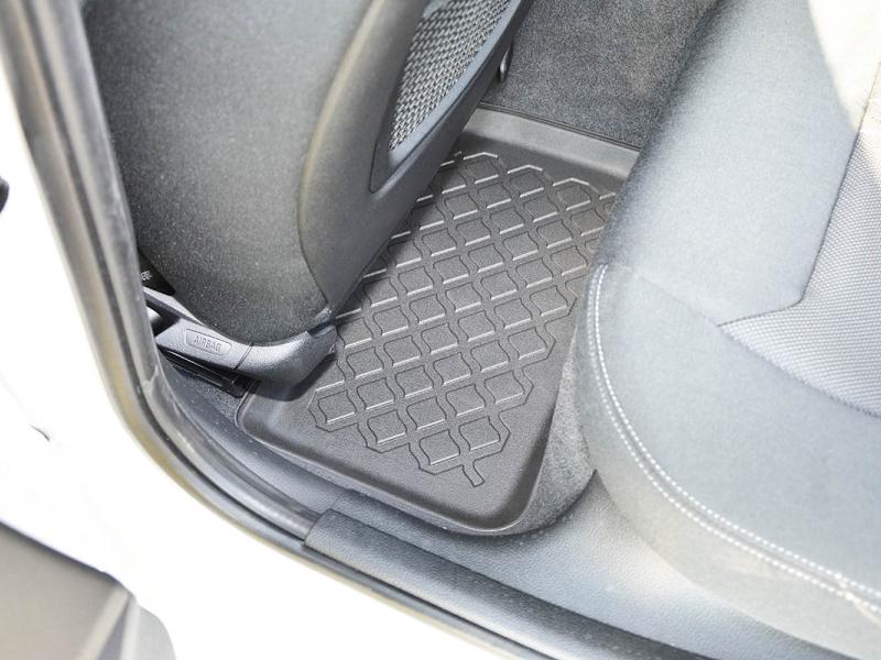 Gumoplastové 3D přesné podlahové koberce ve tvaru vaničky pod nohy pasažérů na vůz BMW 1 (F21) Hatchback, 5 dveří rok výroby 09.2012 - 06.2019, od polské firmy Aristar, které zabraňují namočení koberců interiéru od mokrých bot nebo bot od sněhu a jsou vyrobené ze stejného materiálu jako vany do kufru od stejnojmenné firmy.