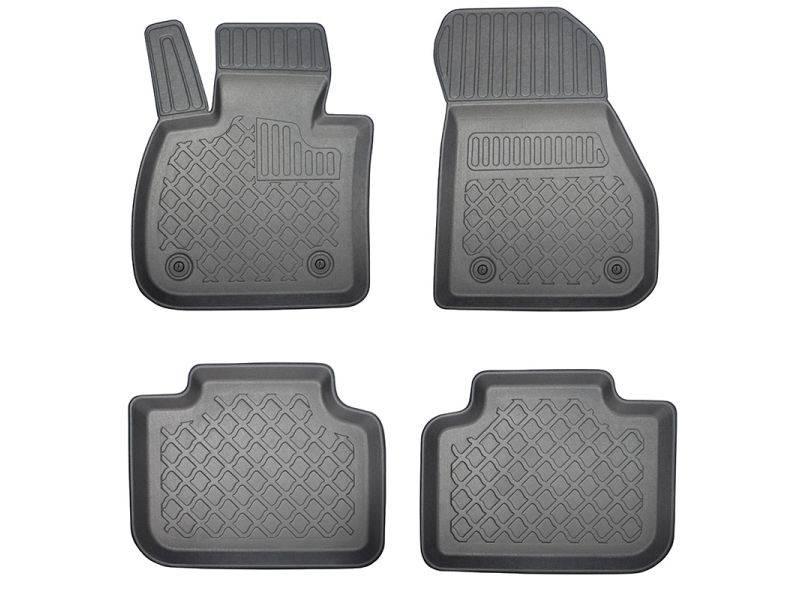 Gumoplastové 3D přesné podlahové koberce ve tvaru vaničky pod nohy pasažérů na vůz BMW X1 (F48) SUV i po faceliftu roku 2019, rok výroby 10.2015 - 09.2022 ne pro Plug-in Hybrid, od polské firmy Aristar, které zabraňují namočení koberců interiéru od mokrých bot nebo bot od sněhu a jsou vyrobené ze stejného materiálu jako vany do kufru od stejnojmenné firmy.