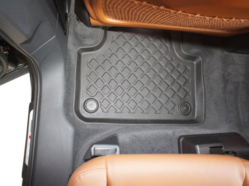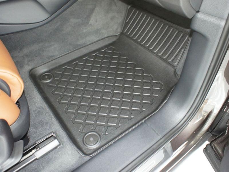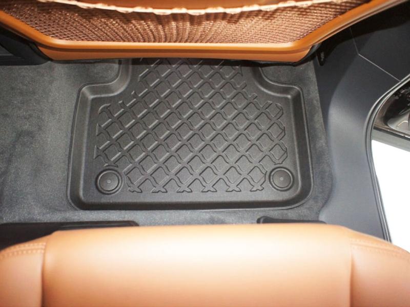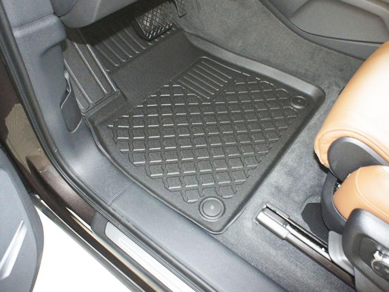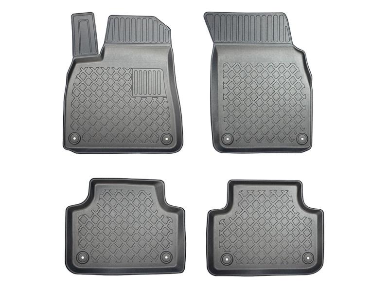 Gumoplastové 3D přesné podlahové koberce ve tvaru vaničky pod nohy pasažérů na vůz Audi Q7 (4M) 5 i 7 míst, pro dvě řady sedaček, SUV, 5dveří, od roku výroby 07.2018 ->, od polské firmy Aristar, které zabraňují namočení koberců interiéru od mokrých bot nebo bot od sněhu a jsou vyrobené ze stejného materiálu jako vany do kufru od stejnojmenné firmy.