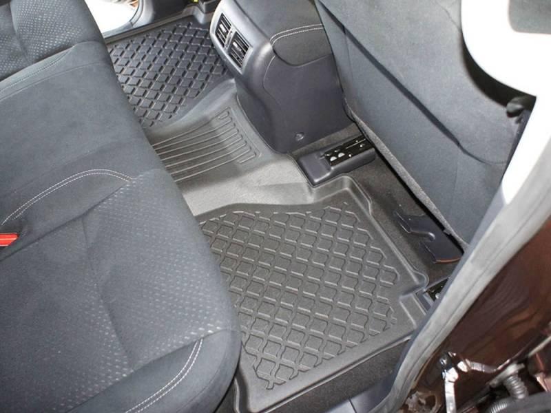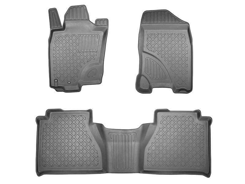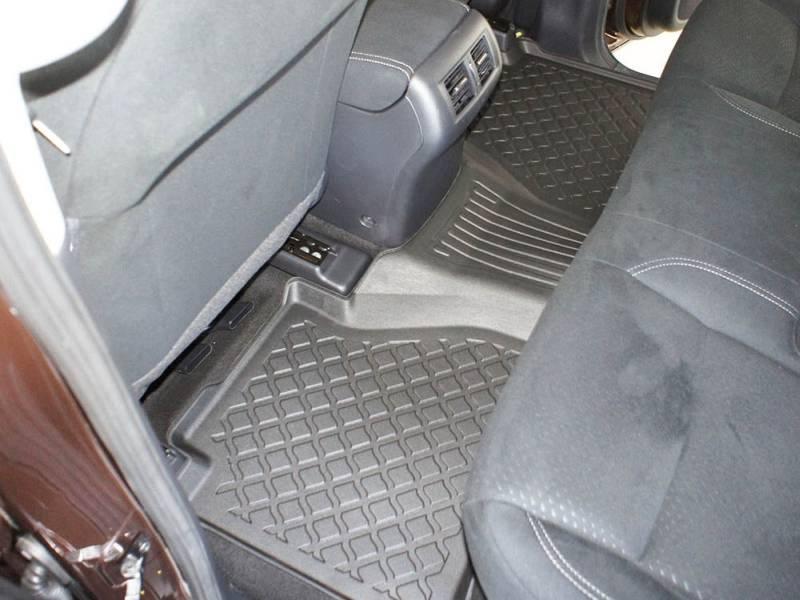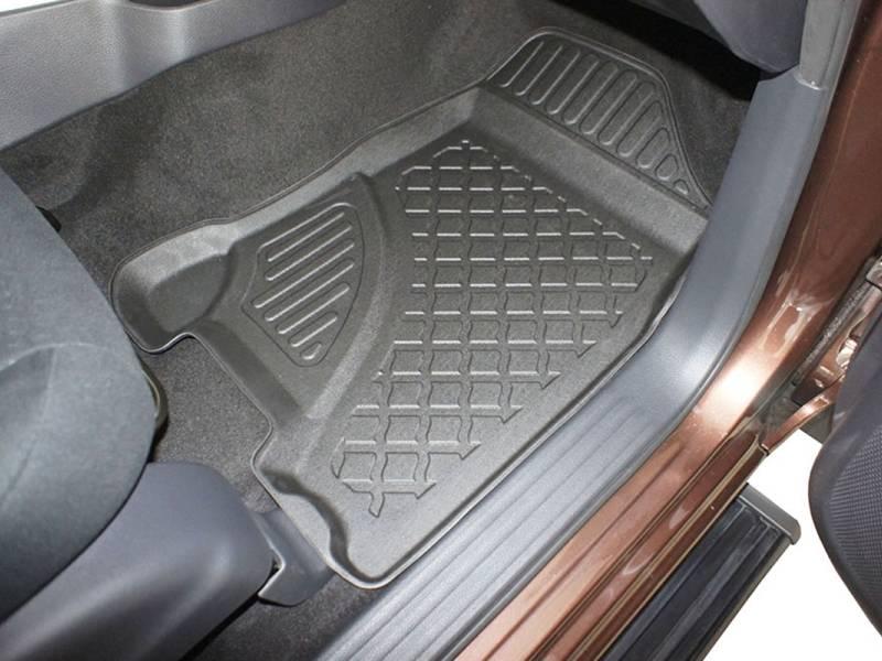 Gumoplastové 3D přesné podlahové koberce ve tvaru vaničky pod nohy pasažérů na vůz Nissan Navara 300 pick-up duble cab, od roku výroby 01.2016 ->, od polské firmy Aristar, které zabraňují namočení koberců interiéru od mokrých bot nebo bot od sněhu a jsou vyrobené ze stejného materiálu jako vany do kufru od stejnojmenné firmy.