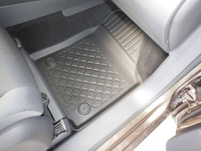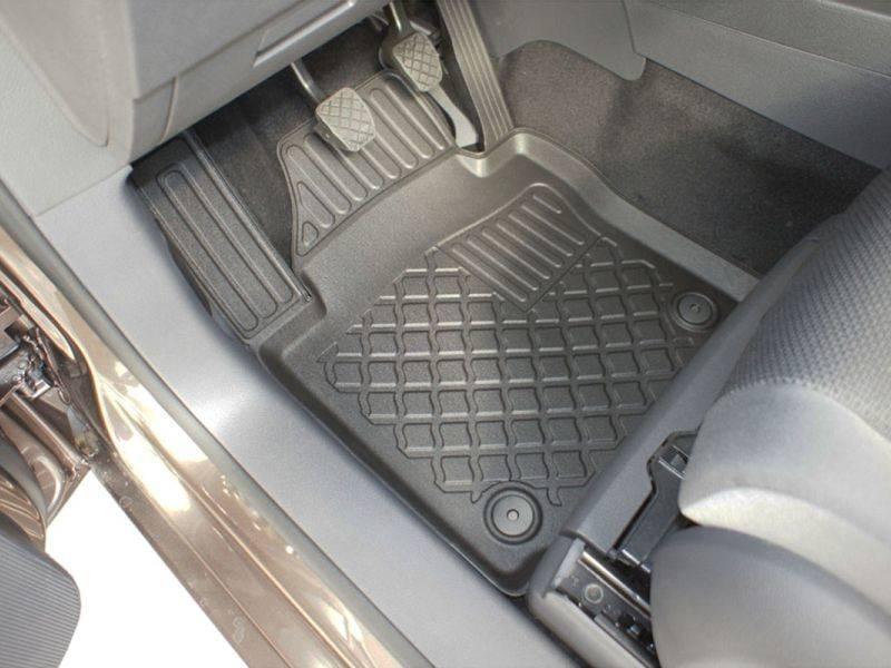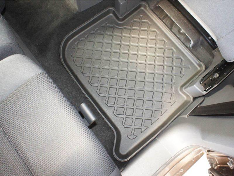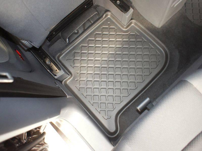 Gumoplastové 3D přesné podlahové koberce ve tvaru vaničky pod nohy pasažérů na vůz Volkswagen Touran I (1T) pro 5 i 7 míst, pouze pro řadu 1 a 2, Van 5 dveří, rok výroby 03.2003 - 08.2015, od polské firmy Aristar, které zabraňují namočení koberců interiéru od mokrých bot nebo bot od sněhu a jsou vyrobené ze stejného materiálu jako vany do kufru od stejnojmenné firmy.