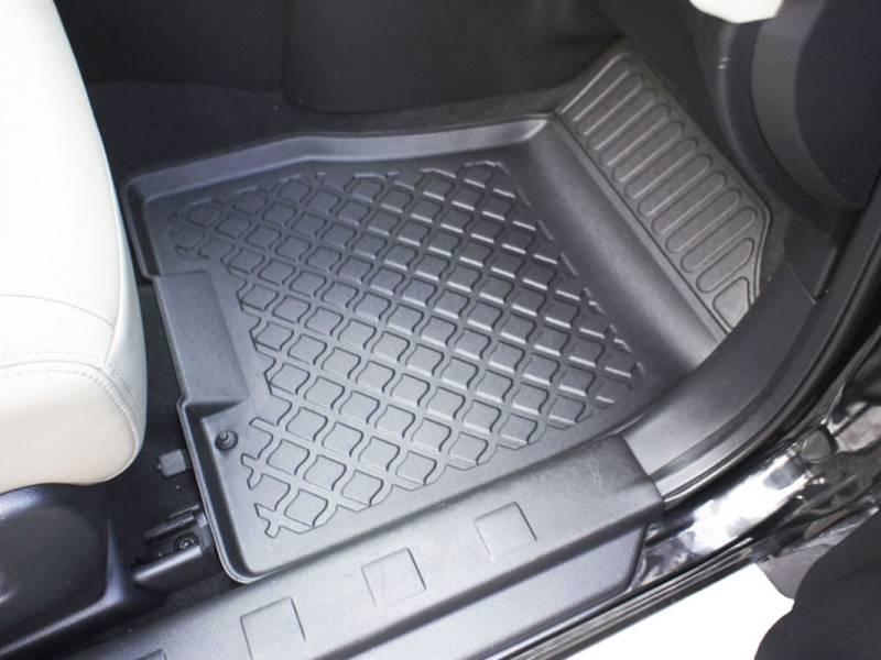 Gumoplastové 3D přesné podlahové koberce ve tvaru vaničky pod nohy pasažérů na vůz Nissan X-Trail II T31, SUV 5 dveří, rok výroby 06.2007 - 07.2014, od polské firmy Aristar, které zabraňují namočení koberců interiéru od mokrých bot nebo bot od sněhu a jsou vyrobené ze stejného materiálu jako vany do kufru od stejnojmenné firmy.