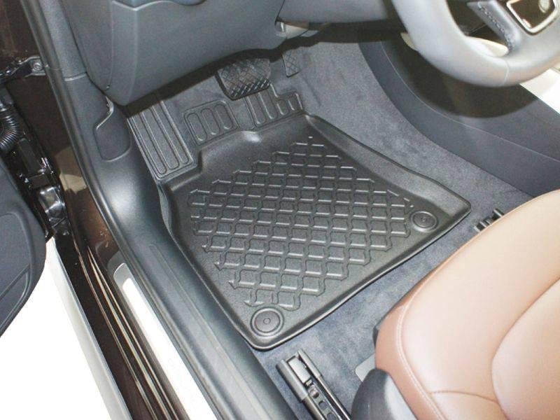 Gumoplastové 3D přesné podlahové koberce ve tvaru vaničky pod nohy pasažérů na vůz Audi A4 (B8) Limousine, 5 míst, rok výroby 04.2008 - 10.2015, od polské firmy Aristar, které zabraňují namočení koberců interiéru od mokrých bot nebo bot od sněhu a jsou vyrobené ze stejného materiálu jako vany do kufru od stejnojmenné firmy.