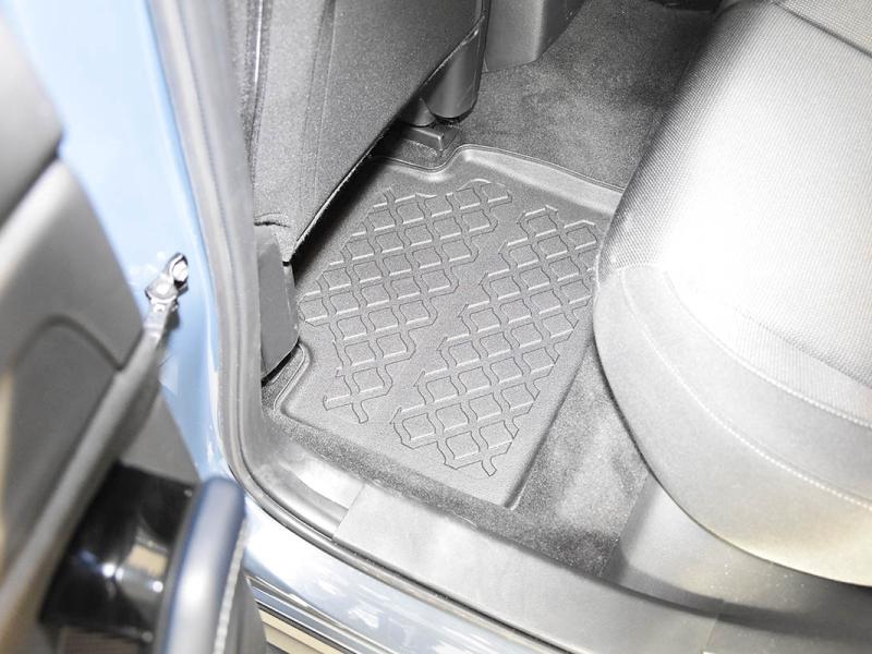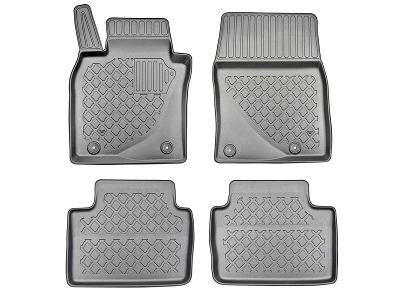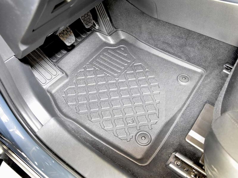 Gumoplastové 3D přesné podlahové koberce ve tvaru vaničky pod nohy pasažérů na vůz Mazda CX-30, SUV, 5 dveří, od roku výroby 08.2019 ->, od polské firmy Aristar, které zabraňují namočení koberců interiéru od mokrých bot nebo bot od sněhu a jsou vyrobené ze stejného materiálu jako vany do kufru od stejnojmenné firmy.