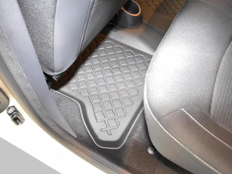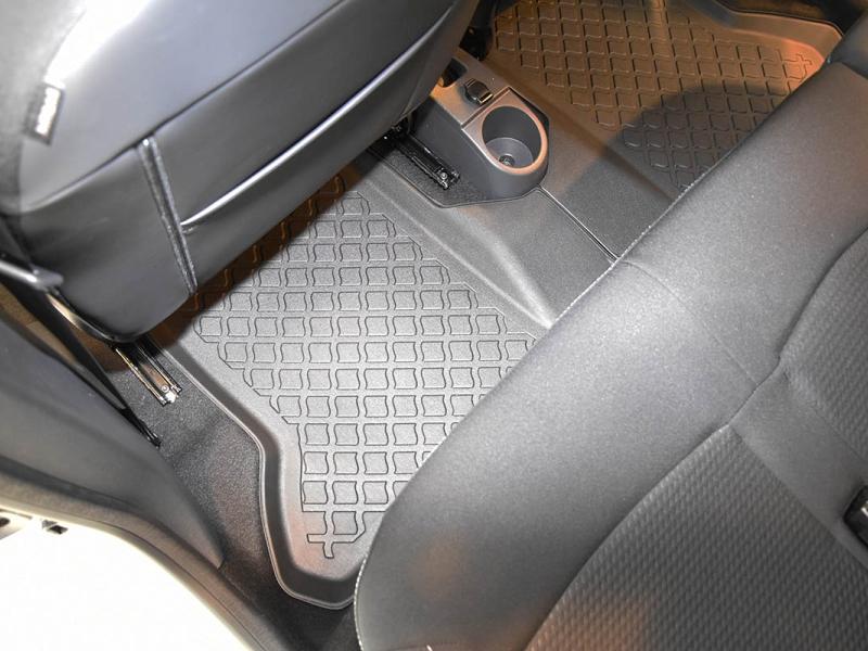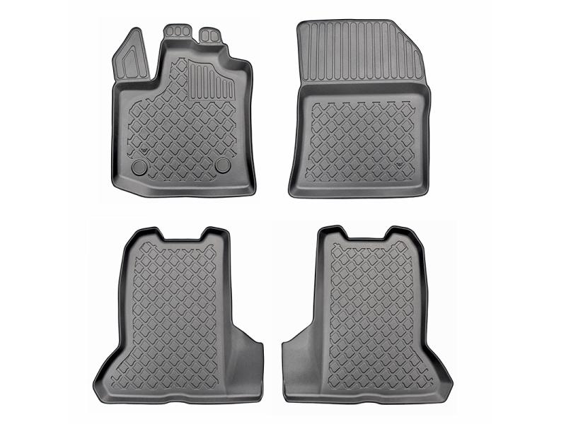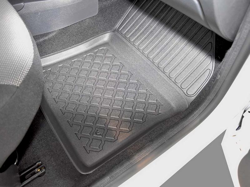 Gumoplastové 3D přesné podlahové koberce ve tvaru vaničky pod nohy pasažérů na vůz Dacia Dokker van, 5 dveří rok výroby 11.2012 - 09.2021, od polské firmy Aristar, které zabraňují namočení koberců interiéru od mokrých bot nebo bot od sněhu a jsou vyrobené ze stejného materiálu jako vany do kufru od stejnojmenné firmy.