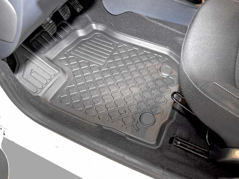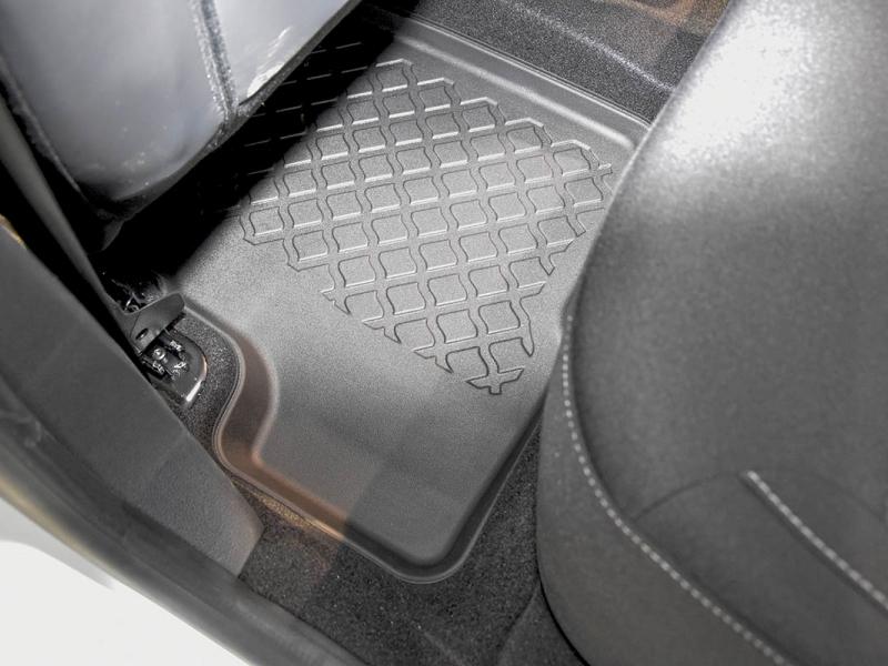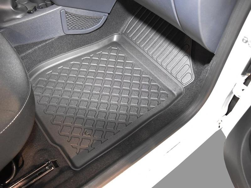 Gumoplastové 3D přesné podlahové koberce ve tvaru vaničky pod nohy pasažérů na vůz Dacia Sandero II i Stepway II hatchback, 5 dveří rok výroby 12.2012 - 12.2020, od polské firmy Aristar, které zabraňují namočení koberců interiéru od mokrých bot nebo bot od sněhu a jsou vyrobené ze stejného materiálu jako vany do kufru od stejnojmenné firmy.