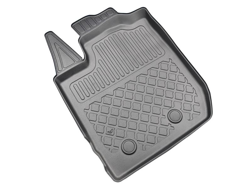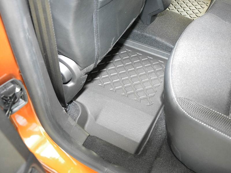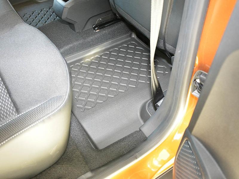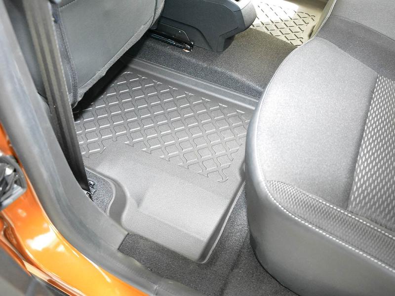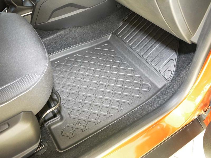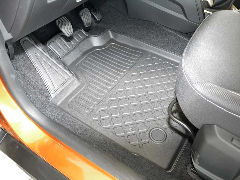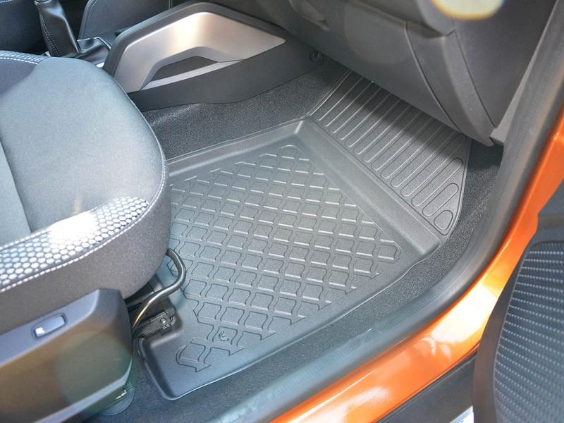 Gumoplastové 3D přesné podlahové koberce ve tvaru vaničky pod nohy pasažérů na vůz Dacia Duster SUV, 2WD i 4WD, 5 dveří od roku výroby 01.2018 -> i po faceliftu od roku výroby 2021 ->, od polské firmy Aristar, které zabraňují namočení koberců interiéru od mokrých bot nebo bot od sněhu a jsou vyrobené ze stejného materiálu jako vany do kufru od stejnojmenné firmy.