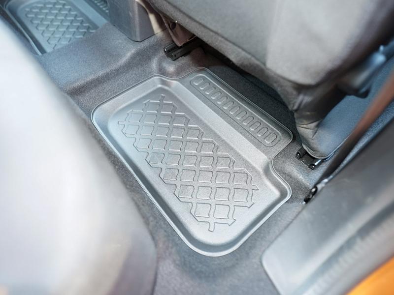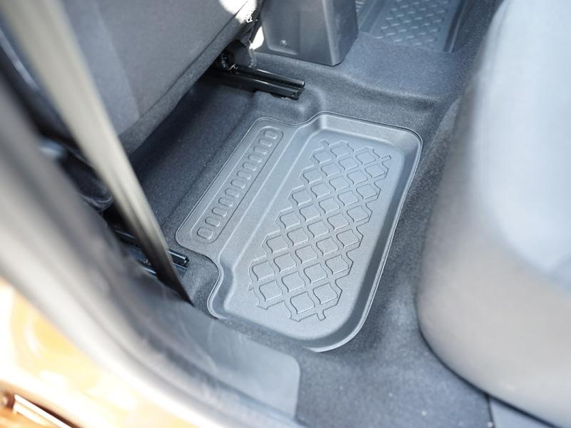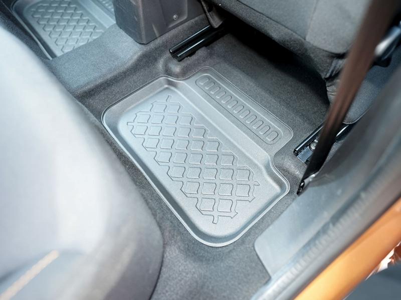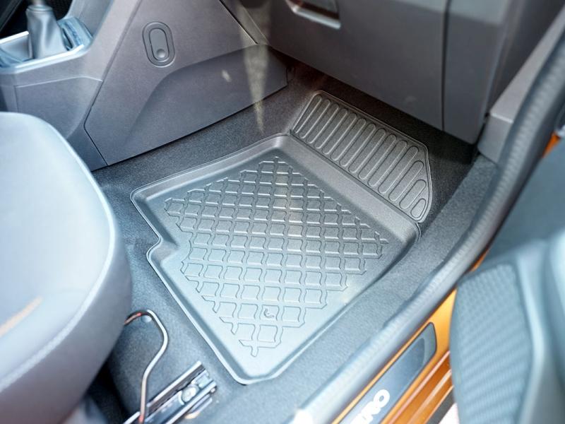 Gumoplastové 3D přesné podlahové koberce ve tvaru vaničky pod nohy pasažérů na vůz Dacia Sandero III i Stepway III hatchback, 5 dveří od roku výroby 01.2021 ->, od polské firmy Aristar, které zabraňují namočení koberců interiéru od mokrých bot nebo bot od sněhu a jsou vyrobené ze stejného materiálu jako vany do kufru od stejnojmenné firmy.