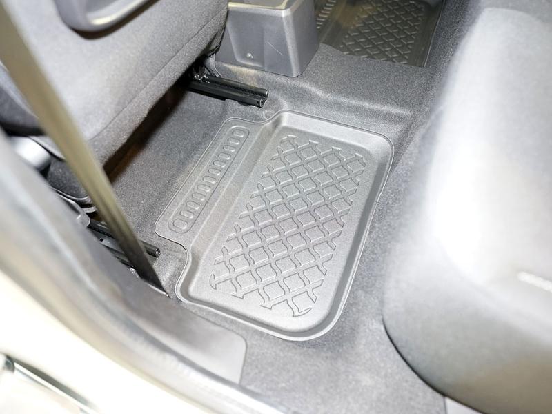 Gumoplastové 3D přesné podlahové koberce ve tvaru vaničky pod nohy pasažérů na vůz Dacia Logan III sedan, 4 dveře od roku výroby 01.2021 ->, od polské firmy Aristar, které zabraňují namočení koberců interiéru od mokrých bot nebo bot od sněhu a jsou vyrobené ze stejného materiálu jako vany do kufru od stejnojmenné firmy.