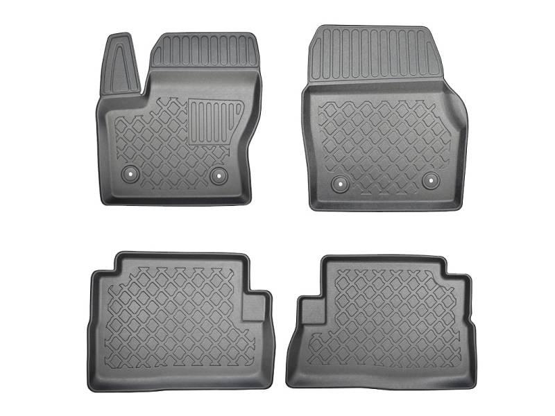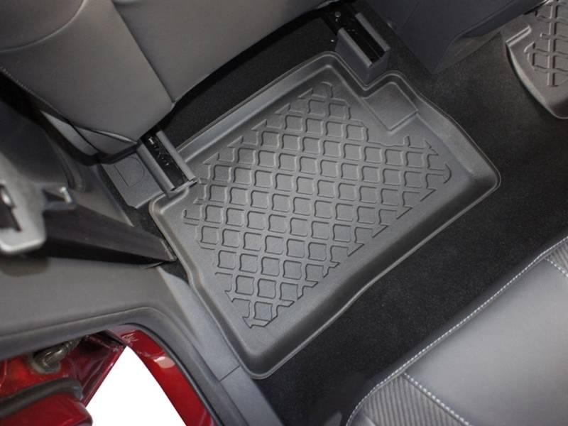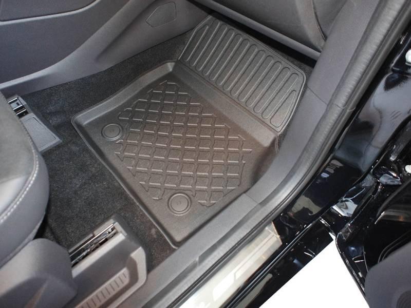 Gumoplastové 3D přesné podlahové koberce ve tvaru vaničky pod nohy pasažérů na vůz Ford Kuga II, SUV 5 dveří, rok výroby 02.2013 - 03.2020, od polské firmy Aristar, které zabraňují namočení koberců interiéru od mokrých bot nebo bot od sněhu a jsou vyrobené ze stejného materiálu jako vany do kufru od stejnojmenné firmy.