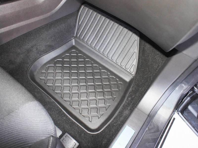 Gumoplastové 3D přesné podlahové koberce ve tvaru vaničky pod nohy pasažérů na vůz Ford Mondeo V, Liftback, Hatchback i Turnier 5 dveří, od roku výroby 01.2015 -> i po faceliftu od roku výroby 2020 ->, od polské firmy Aristar, které zabraňují namočení koberců interiéru od mokrých bot nebo bot od sněhu a jsou vyrobené ze stejného materiálu jako vany do kufru od stejnojmenné firmy.