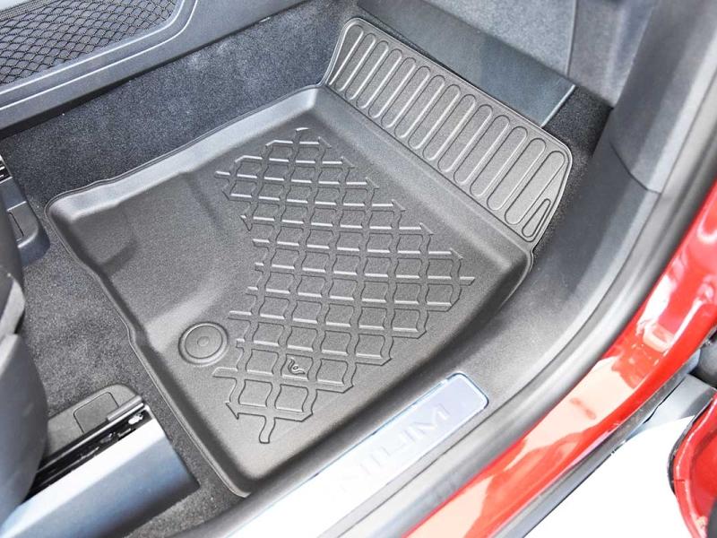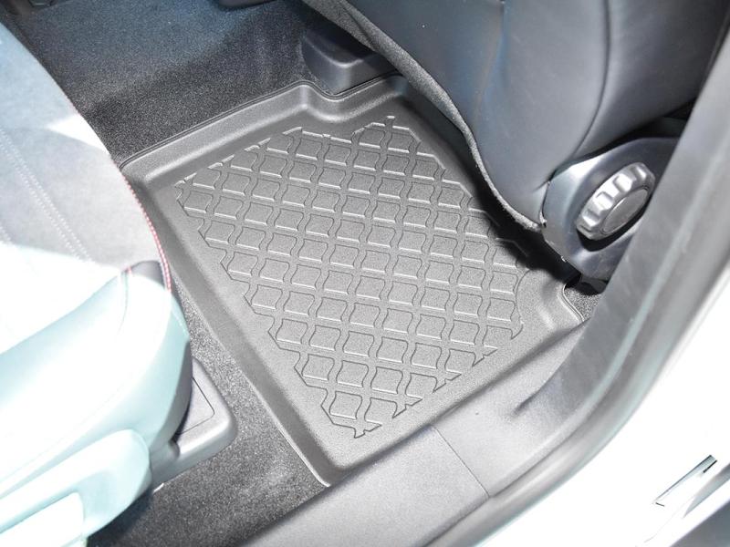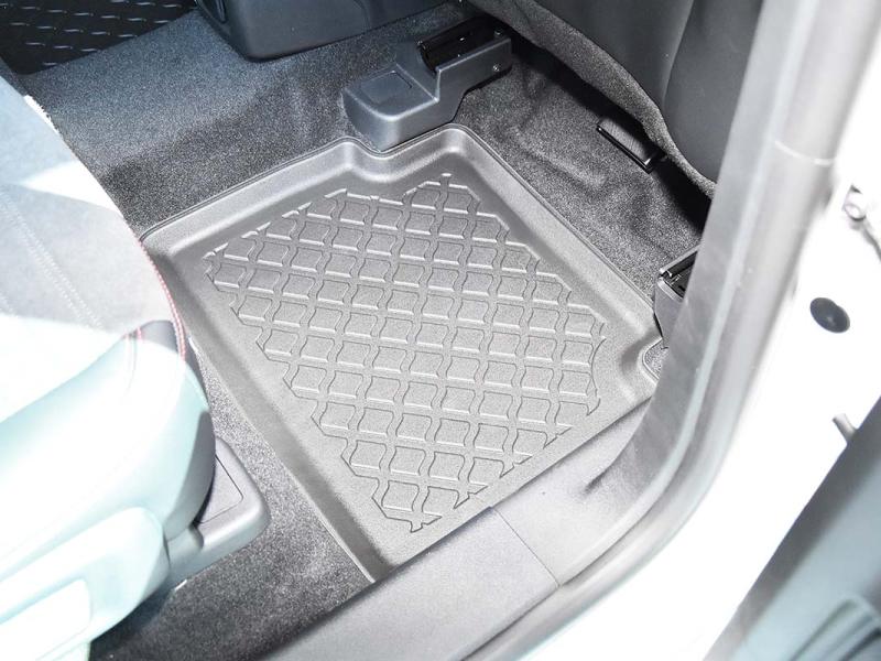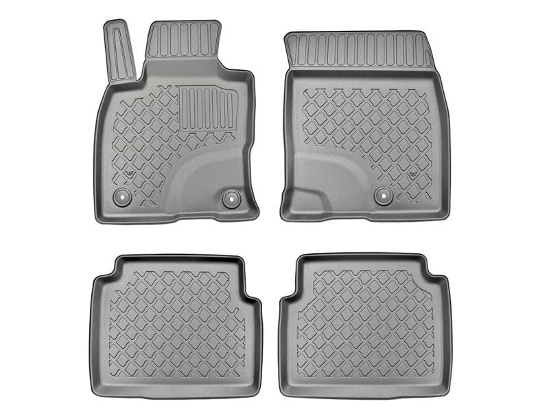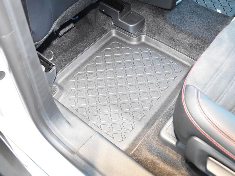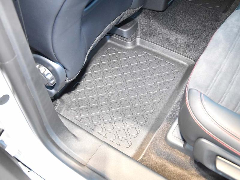 Gumoplastové 3D přesné podlahové koberce ve tvaru vaničky pod nohy pasažérů na vůz Ford Kuga III, SUV, 5 dveří, od roku výroby 04.2020 ->, nejsou určeny pro Plug-in Hybrid, od polské firmy Aristar, které zabraňují namočení koberců interiéru od mokrých bot nebo bot od sněhu a jsou vyrobené ze stejného materiálu jako vany do kufru od stejnojmenné firmy.