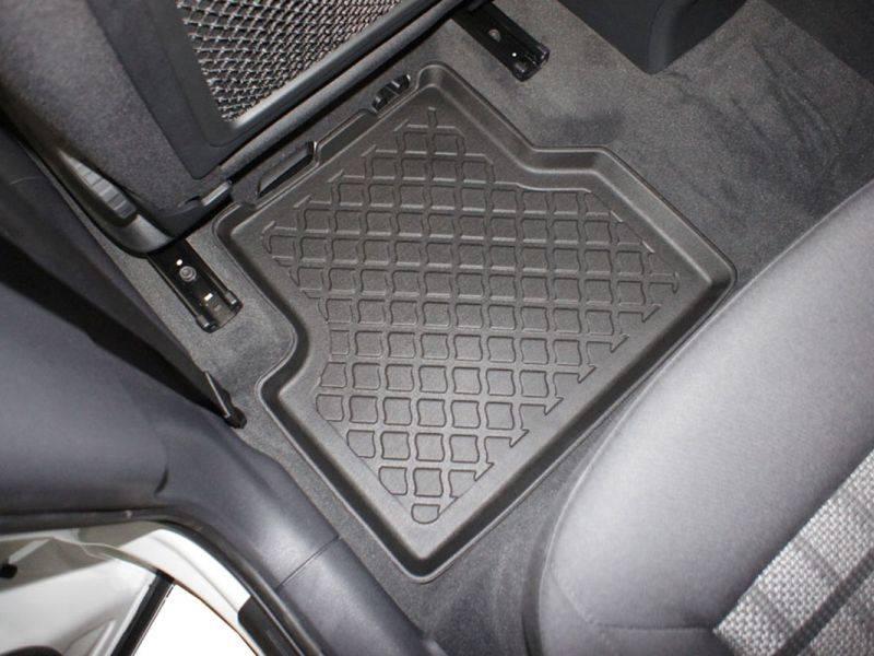 Gumoplastové 3D přesné podlahové koberce ve tvaru vaničky pod nohy pasažérů na vůz Audi Q3, SUV, 5 míst, rok výroby 08.2011 - 06.2018, od polské firmy Aristar, které zabraňují namočení koberců interiéru od mokrých bot nebo bot od sněhu a jsou vyrobené ze stejného materiálu jako vany do kufru od stejnojmenné firmy.