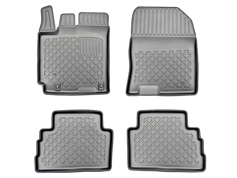 Gumoplastové 3D přesné podlahové koberce ve tvaru vaničky pod nohy pasažérů na vůz Hyundai Kona SUV 5 dveří rok výroby 11.2017 - 2020 i po faceliftu Hyundai Kona SUV, 5 dveří od roku výroby 2020 ->, nejsou určeny pro eleckrickou a hybridní verzi, od polské firmy Aristar, které zabraňují namočení koberců interiéru od mokrých bot nebo bot od sněhu a jsou vyrobené ze stejného materiálu jako vany do kufru od stejnojmenné firmy.