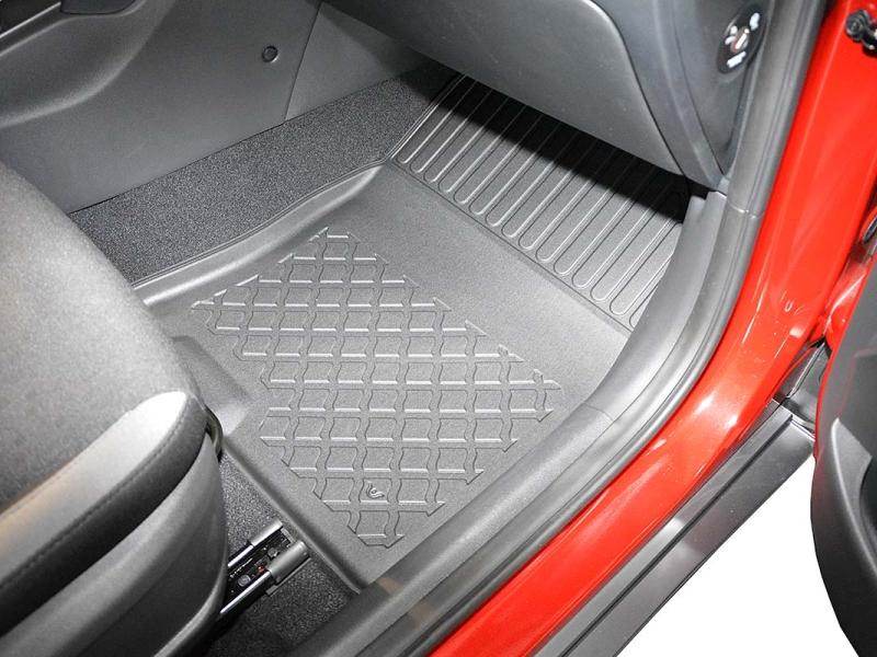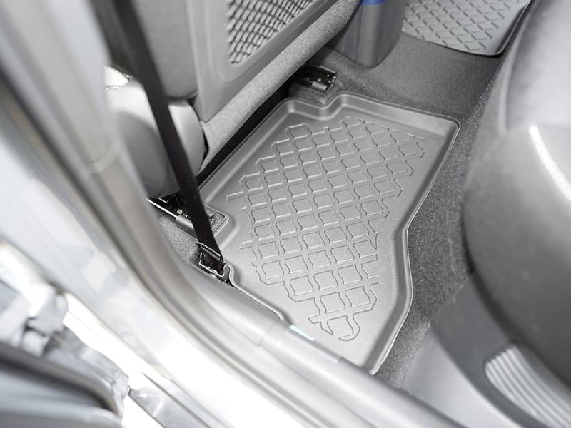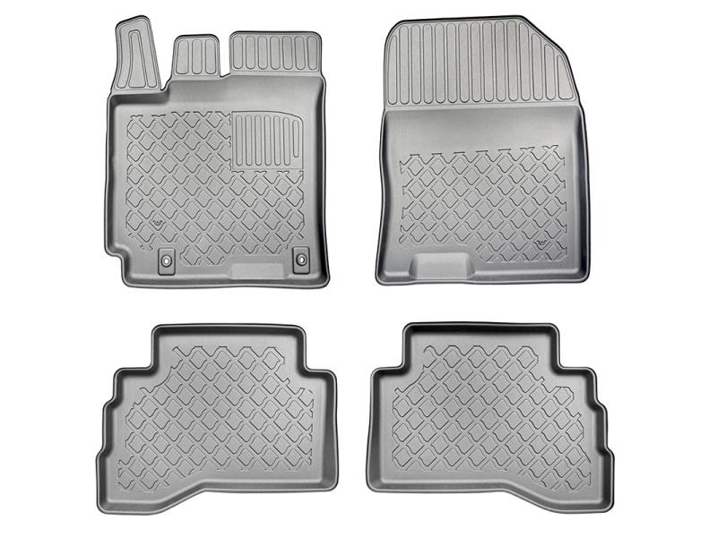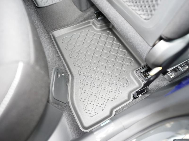 Gumoplastové 3D přesné podlahové koberce ve tvaru vaničky pod nohy pasažérů na vůz Hyundai Kona Hybrid, SUV, 5 dveří od roku výroby 09.2019 ->, nejsou určeny pro elektrickou verzi, od polské firmy Aristar, které zabraňují namočení koberců interiéru od mokrých bot nebo bot od sněhu a jsou vyrobené ze stejného materiálu jako vany do kufru od stejnojmenné firmy.