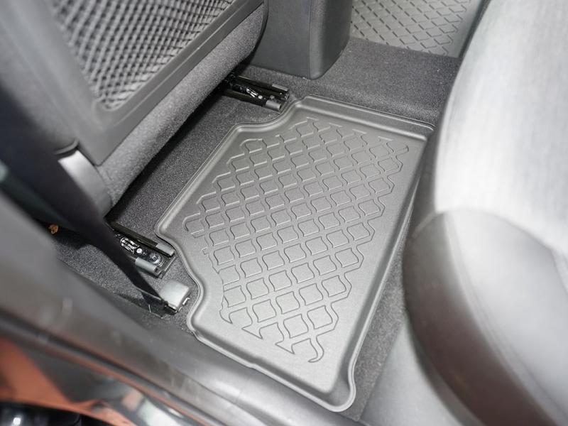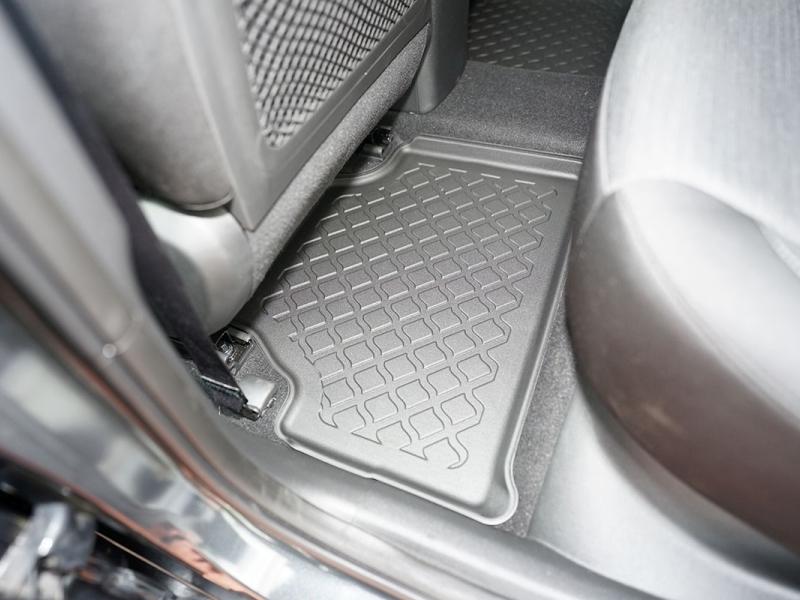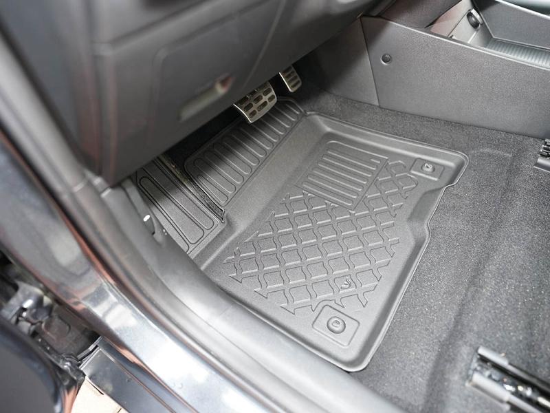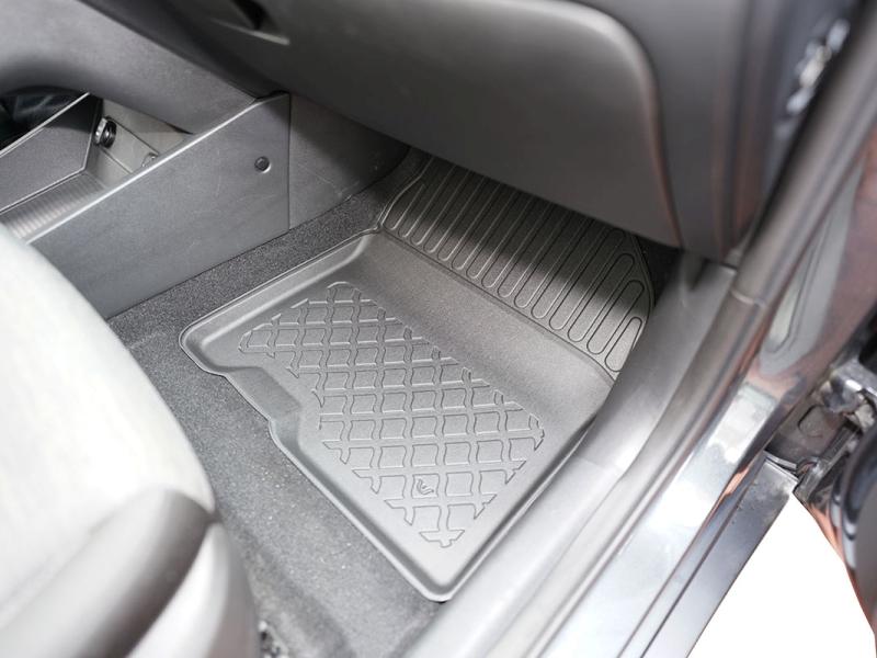 Gumoplastové 3D přesné podlahové koberce ve tvaru vaničky pod nohy pasažérů na vůz Hyundai Kona Electric, SUV, 5 dveří od roku výroby 08.2018 ->, nejsou určeny pro hybridní verzi, od polské firmy Aristar, které zabraňují namočení koberců interiéru od mokrých bot nebo bot od sněhu a jsou vyrobené ze stejného materiálu jako vany do kufru od stejnojmenné firmy.
