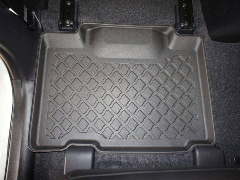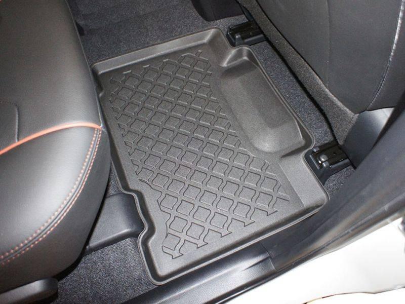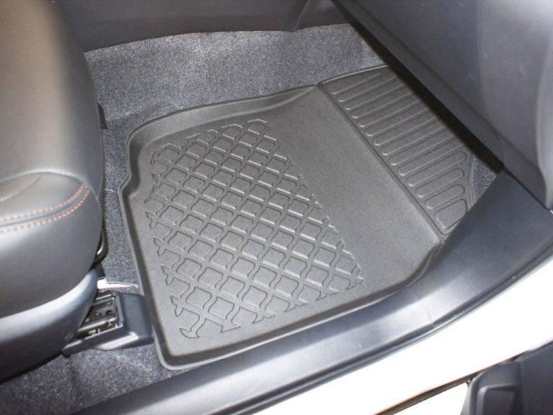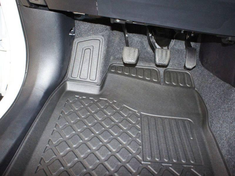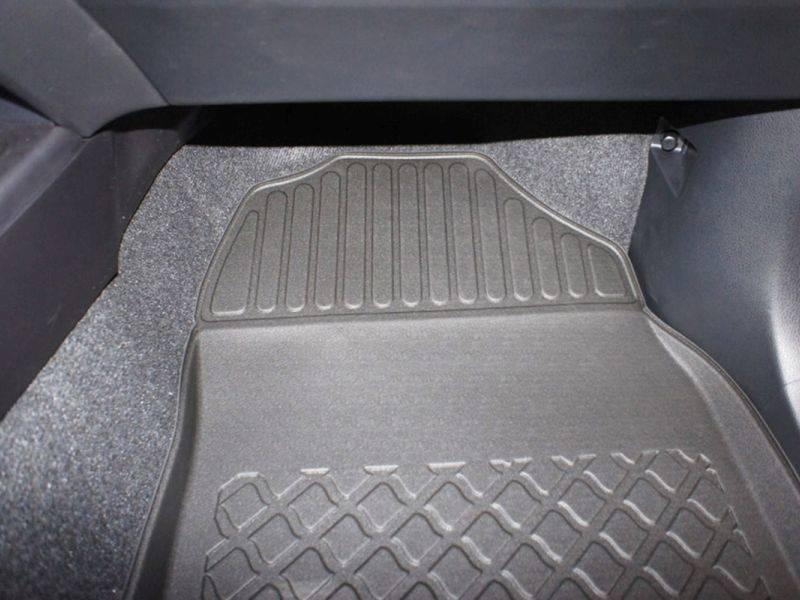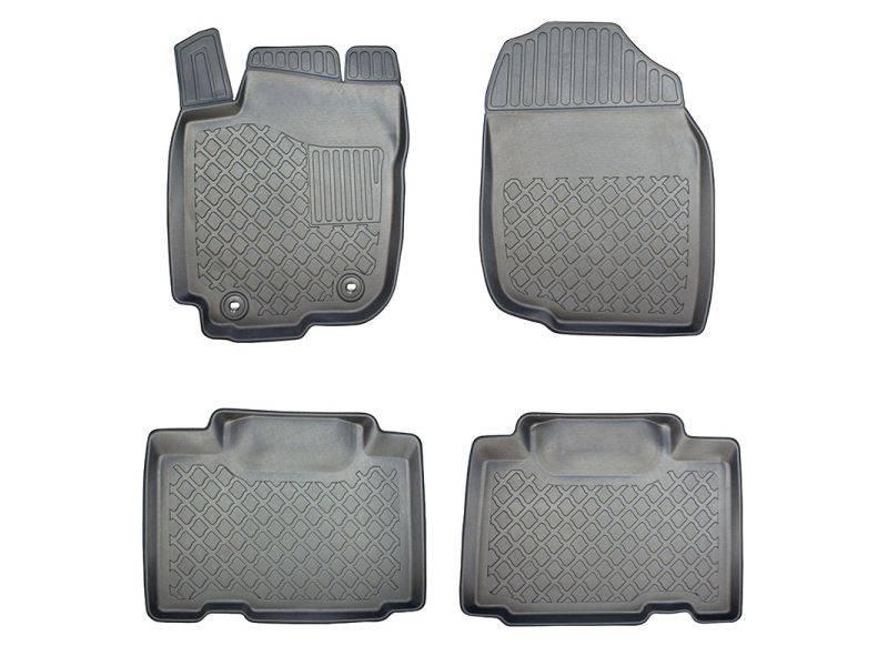 Gumoplastové 3D přesné podlahové koberce ve tvaru vaničky pod nohy pasažérů na vůz Toyota RAV 4 IV SUV 5 dveří, od roku výroby 03.2013 ->, od polské firmy Aristar, které zabraňují namočení koberců interiéru od mokrých bot nebo bot od sněhu a jsou vyrobené ze stejného materiálu jako vany do kufru od stejnojmenné firmy.