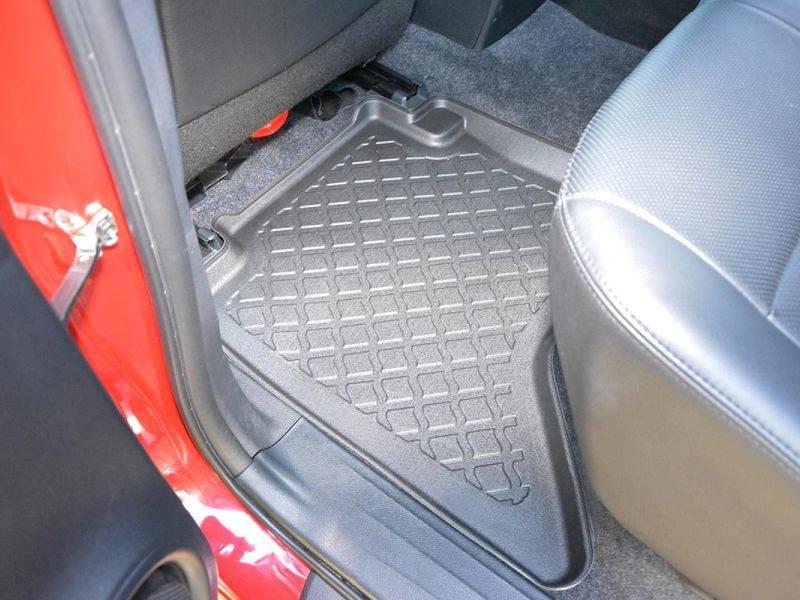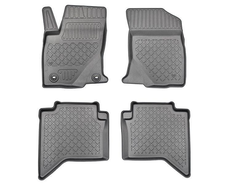 Gumoplastové 3D přesné podlahové koberce ve tvaru vaničky pod nohy pasažérů na vůz Toyota Hilux 8th generation pick-up double cab 4 dveře, od roku výroby 09.2016 ->, od polské firmy Aristar, které zabraňují namočení koberců interiéru od mokrých bot nebo bot od sněhu a jsou vyrobené ze stejného materiálu jako vany do kufru od stejnojmenné firmy.