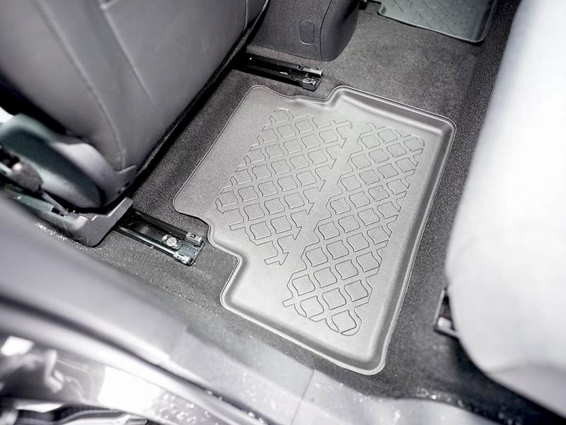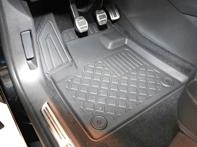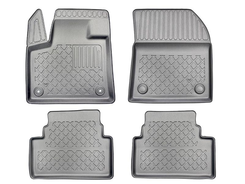 Gumoplastové 3D přesné podlahové koberce ve tvaru vaničky pod nohy pasažérů na vůz Citroen C5 Aircross Plug-in Hybrid SUV i po faceliftu roku 2022, 5 dveří od roku výroby 01.2020 ->, od polské firmy Aristar, které zabraňují namočení koberců interiéru od mokrých bot nebo bot od sněhu a jsou vyrobené ze stejného materiálu jako vany do kufru od stejnojmenné firmy.
