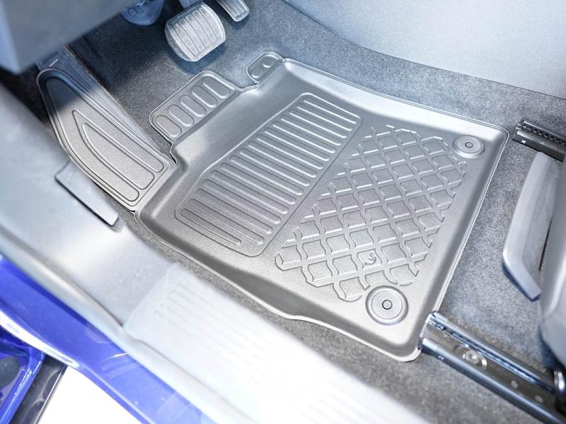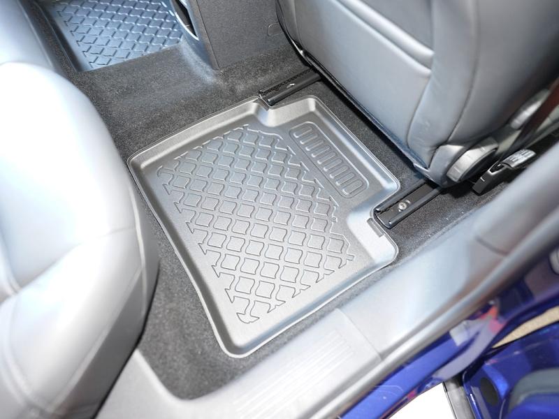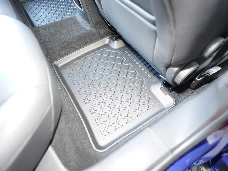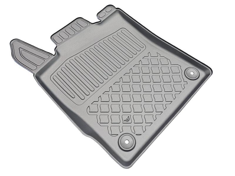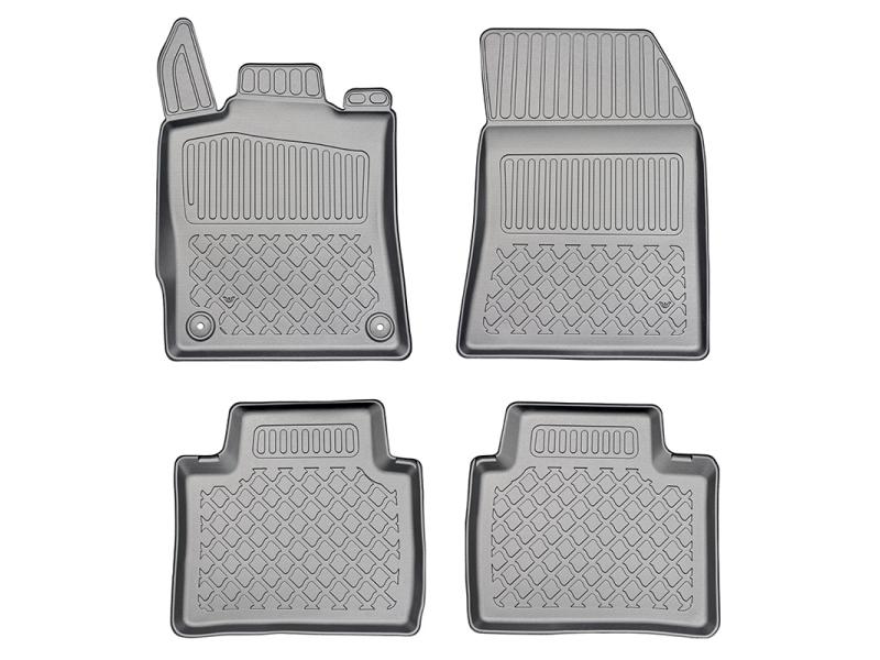 Gumoplastové 3D přesné podlahové koberce ve tvaru vaničky pod nohy pasažérů na vůz Citroen C5 X Plug-in Hybrid SUV od roku výroby 05.2022 ->, od polské firmy Aristar, které zabraňují namočení koberců interiéru od mokrých bot nebo bot od sněhu a jsou vyrobené ze stejného materiálu jako vany do kufru od stejnojmenné firmy.
