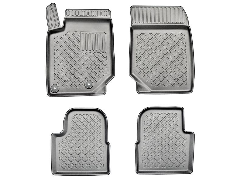 Gumoplastové 3D přesné podlahové koberce ve tvaru vaničky pod nohy pasažérů na vůz Peugeot 2008 II SUV, od roku výroby 01.2020 ->, od polské firmy Aristar, které zabraňují namočení koberců interiéru od mokrých bot nebo bot od sněhu a jsou vyrobené ze stejného materiálu jako vany do kufru od stejnojmenné firmy.