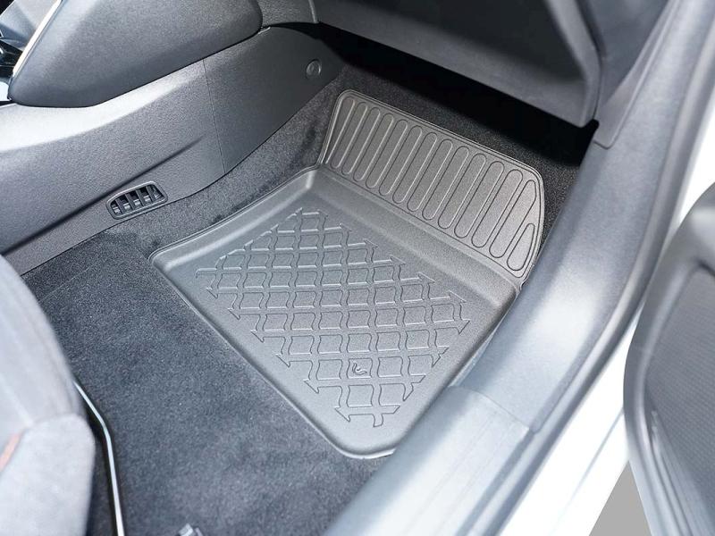 Gumoplastové 3D přesné podlahové koberce ve tvaru vaničky pod nohy pasažérů na vůz Peugeot e-2008 elektric SUV, 5 dveří od roku výroby 08.2020 ->, od polské firmy Aristar, které zabraňují namočení koberců interiéru od mokrých bot nebo bot od sněhu a jsou vyrobené ze stejného materiálu jako vany do kufru od stejnojmenné firmy.