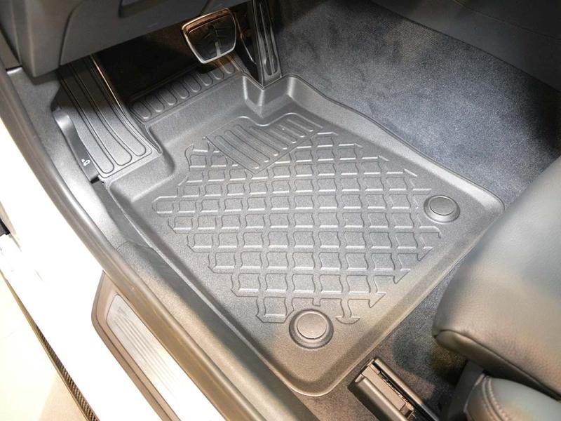 Gumoplastové 3D přesné podlahové koberce ve tvaru vaničky pod nohy pasažérů na vůz BMW 5 (G30) Plug-in Hybrid Limousine sedan 4 dveře, od roku výroby 02.2017 ->, od polské firmy Aristar, které zabraňují namočení koberců interiéru od mokrých bot nebo bot od sněhu a jsou vyrobené ze stejného materiálu jako vany do kufru od stejnojmenné firmy.