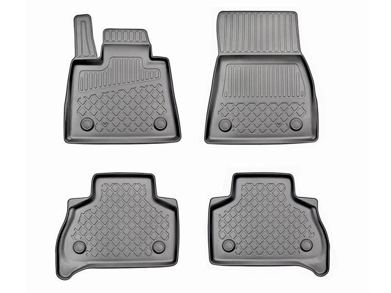 Gumoplastové 3D přesné podlahové koberce ve tvaru vaničky pod nohy pasažérů na vůz BMW X5 (G05) SUV 5 i 7 míst bez třetí řady, 5 dveří od roku výroby 11.2018 ->, od polské firmy Aristar, které zabraňují namočení koberců interiéru od mokrých bot nebo bot od sněhu a jsou vyrobené ze stejného materiálu jako vany do kufru od stejnojmenné firmy.