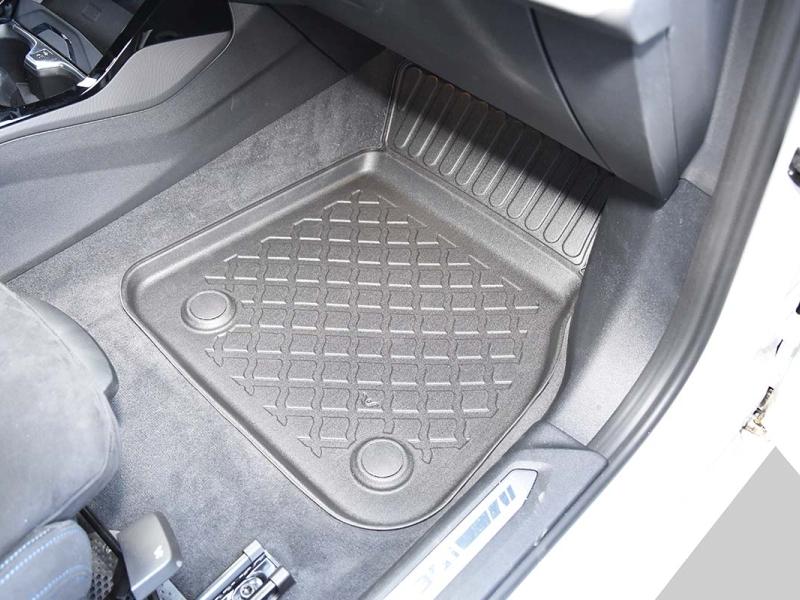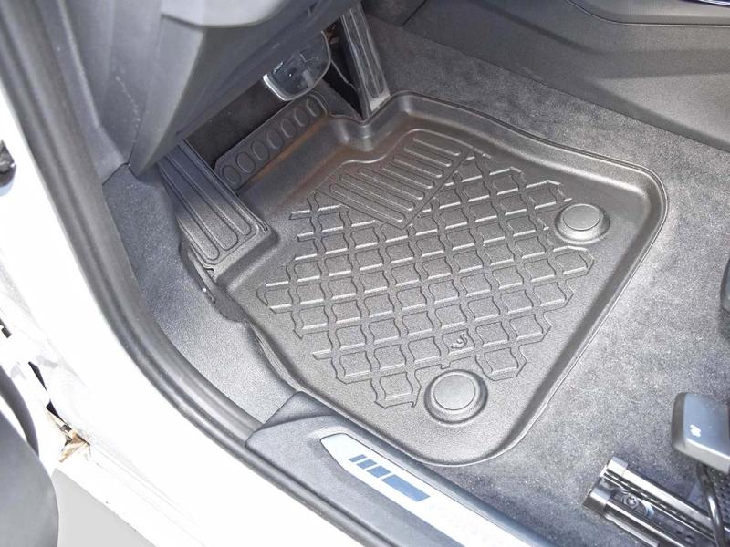 Gumoplastové 3D přesné podlahové koberce ve tvaru vaničky pod nohy pasažérů na vůz BMW 1 (F40) Hatchback, 5 dveří od roku výroby 09.2019 ->, od polské firmy Aristar, které zabraňují namočení koberců interiéru od mokrých bot nebo bot od sněhu a jsou vyrobené ze stejného materiálu jako vany do kufru od stejnojmenné firmy.