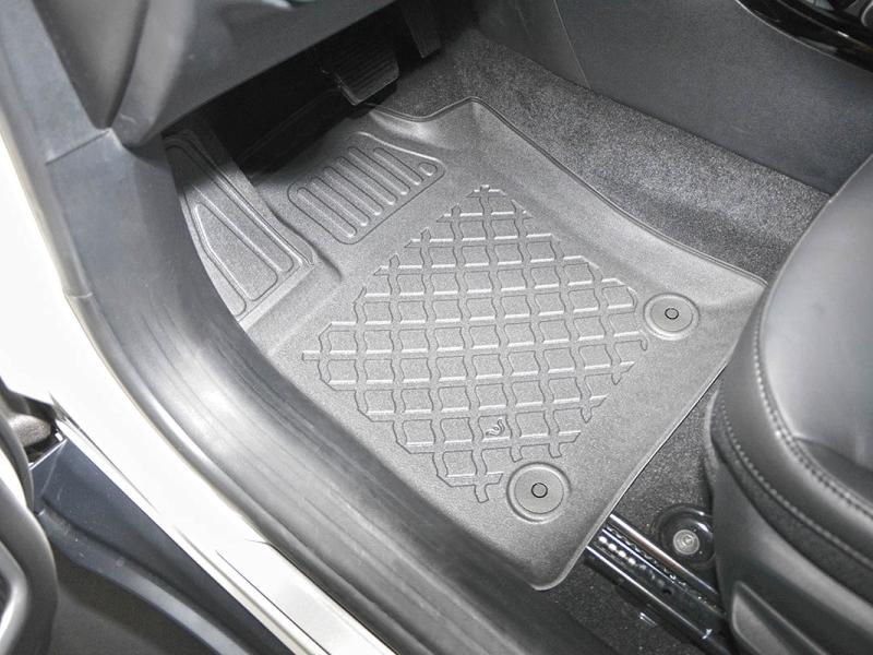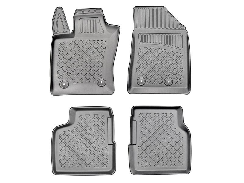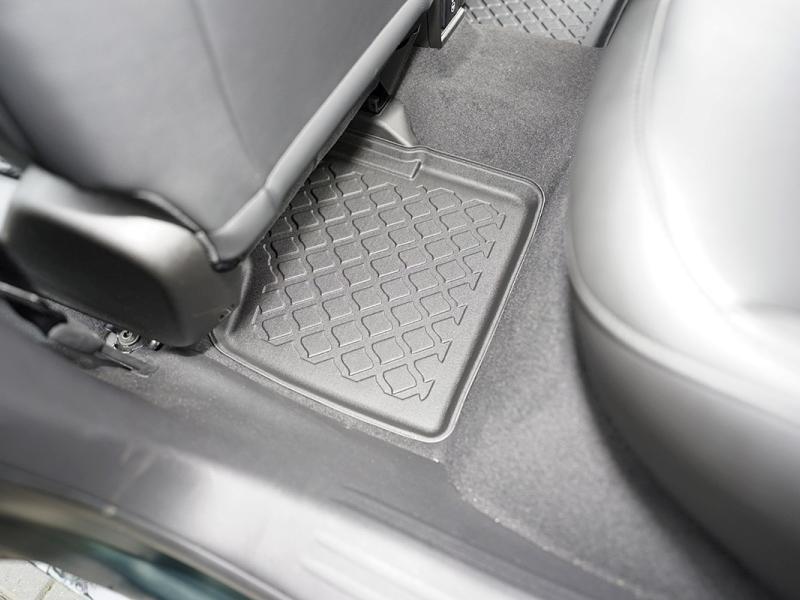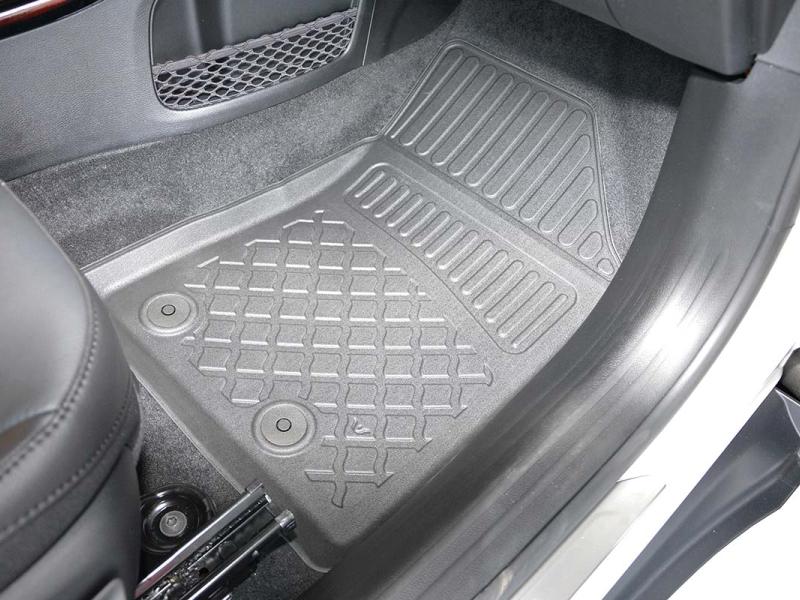 Gumoplastové 3D přesné podlahové koberce ve tvaru vaničky pod nohy pasažérů na vůz Jeep Compass II MP 4xe, SUV, 5 dveří od roku výroby 07.2020 -> i po faceliftu Jeep Compass II Plug-in Hybrid od roku výroby 2021 ->, od polské firmy Aristar, které zabraňují namočení koberců interiéru od mokrých bot nebo bot od sněhu a jsou vyrobené ze stejného materiálu jako vany do kufru od stejnojmenné firmy.