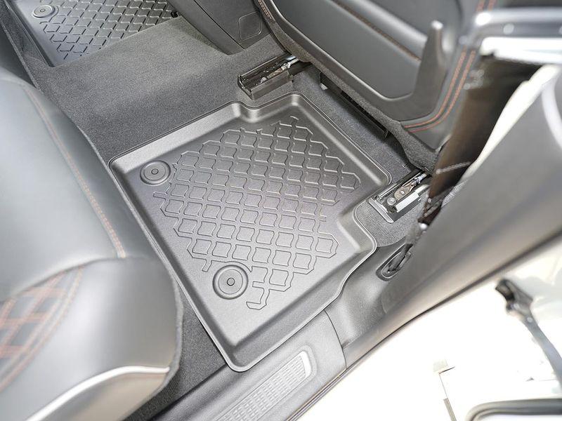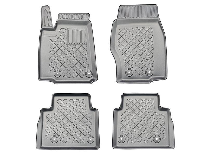 Gumoplastové 3D přesné podlahové koberce ve tvaru vaničky pod nohy pasažérů na vůz Jeep Grand Cherokee V WL, 4xe Plug-in Hybrid, SUV, 5 dveří od roku výroby 05.2022 ->, od polské firmy Aristar, které zabraňují namočení koberců interiéru od mokrých bot nebo bot od sněhu a jsou vyrobené ze stejného materiálu jako vany do kufru od stejnojmenné firmy.