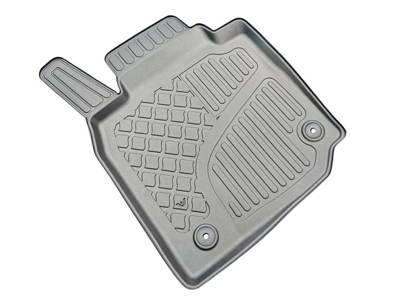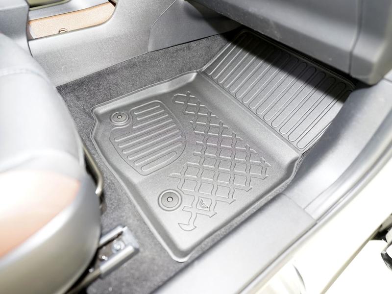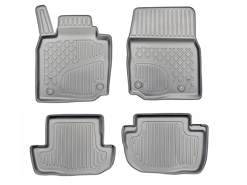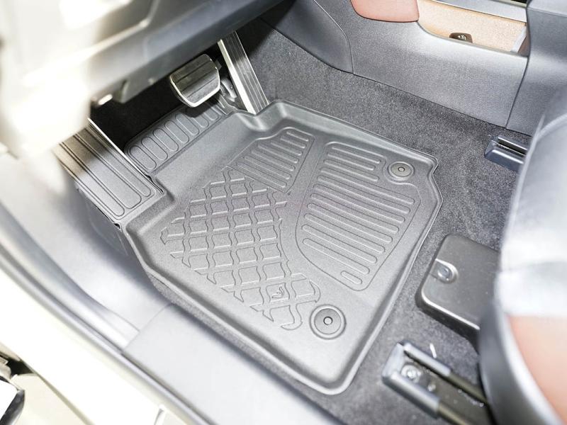 Gumoplastové 3D přesné podlahové koberce ve tvaru vaničky pod nohy pasažérů na vůz Mazda MX-30 Electric, SUV, 5 dveří, od roku výroby 09.2020 ->, od polské firmy Aristar, které zabraňují namočení koberců interiéru od mokrých bot nebo bot od sněhu a jsou vyrobené ze stejného materiálu jako vany do kufru od stejnojmenné firmy.