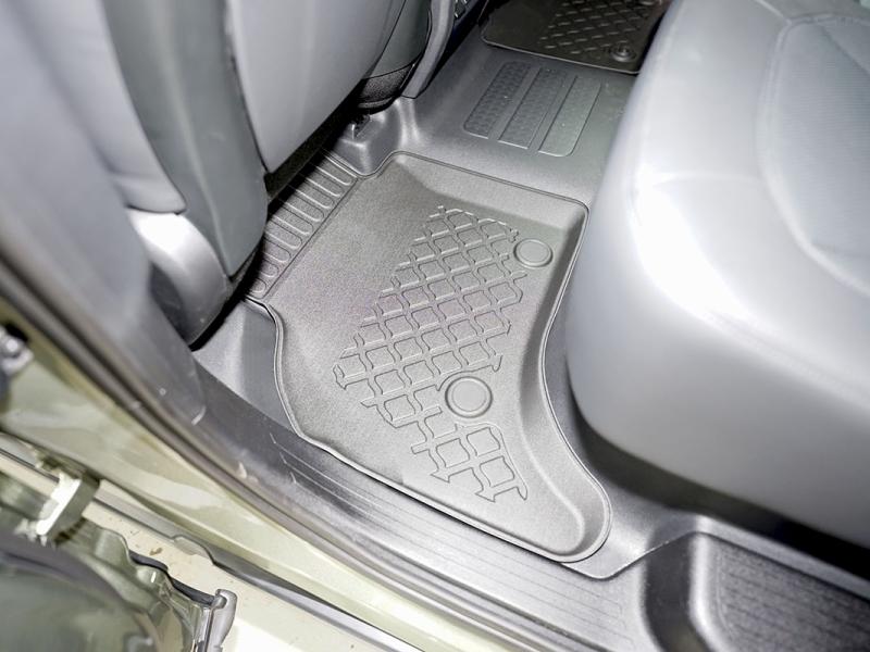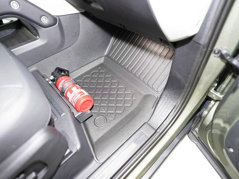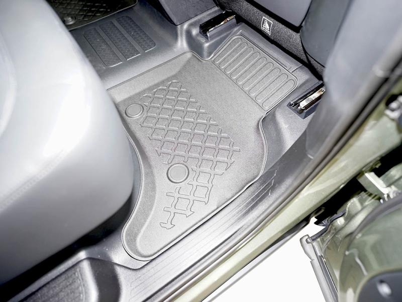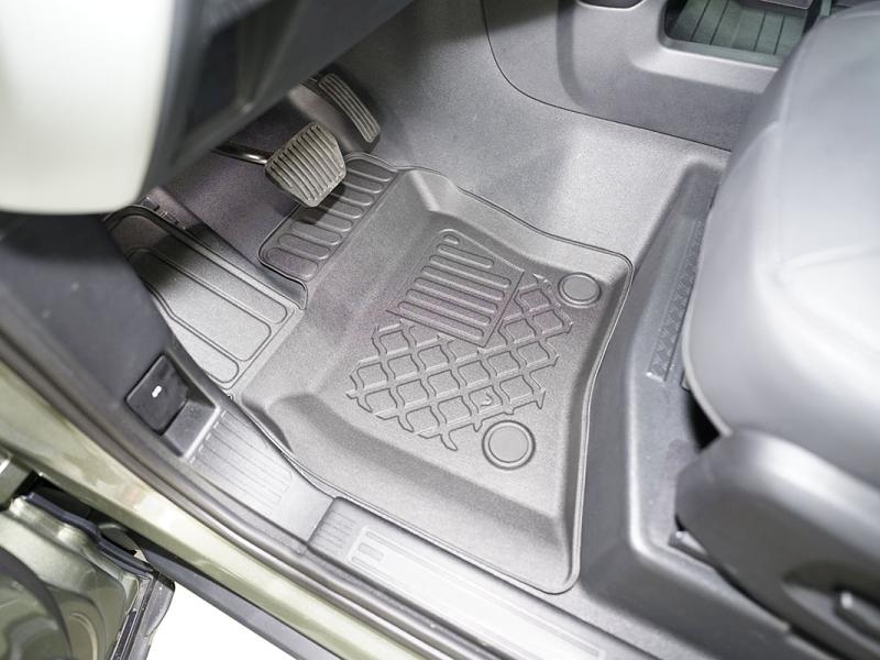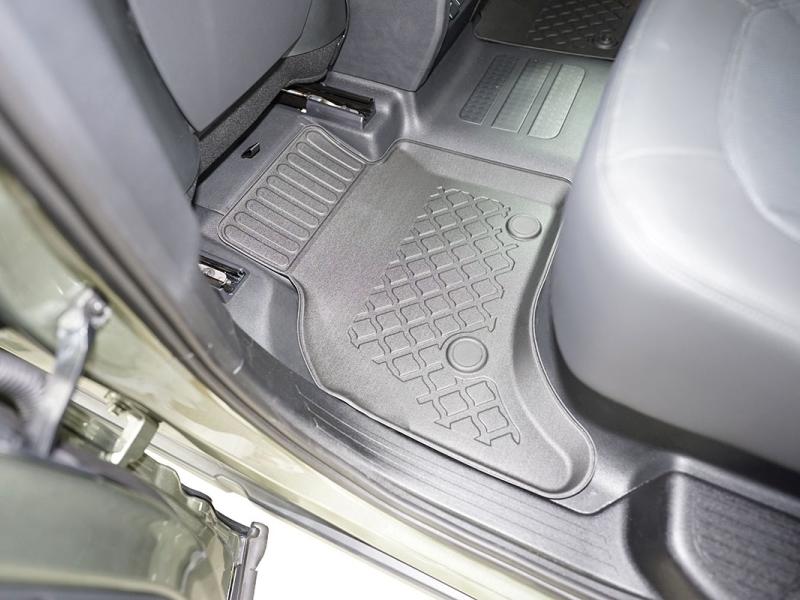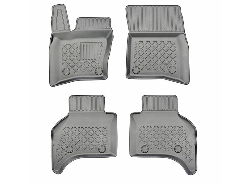 Gumoplastové 3D přesné podlahové koberce ve tvaru vaničky pod nohy pasažérů na vůz Land Rover Defender 110, L663, SUV, 5 dveří, od roku výroby 01.2020 ->, od polské firmy Aristar, které zabraňují namočení koberců interiéru od mokrých bot nebo bot od sněhu a jsou vyrobené ze stejného materiálu jako vany do kufru od stejnojmenné firmy.