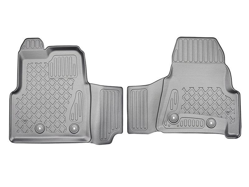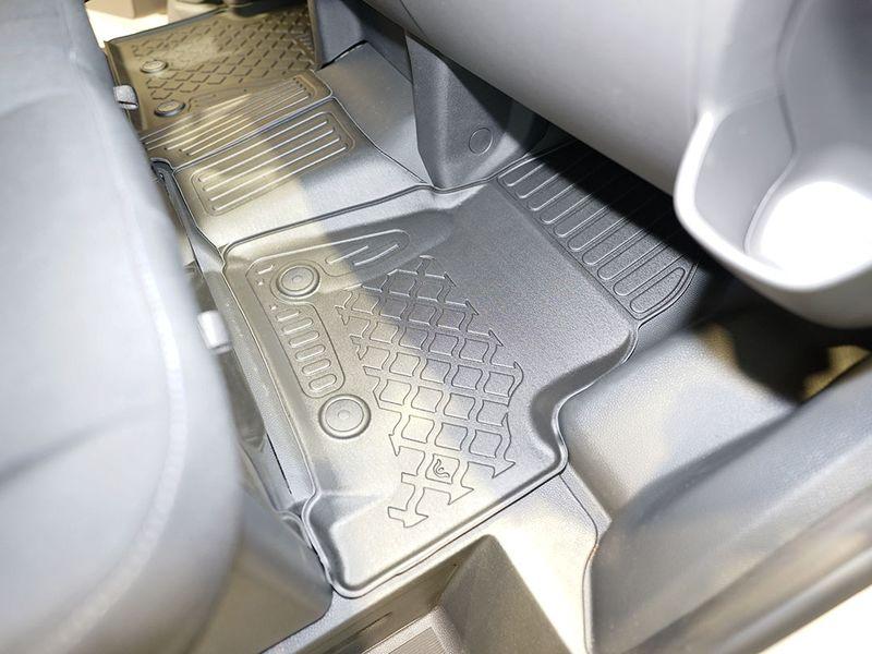 Gumoplastové 3D přesné podlahové koberce ve tvaru vaničky pod nohy pasažérů na vůz Ford Tourneo Custom Van manuál, 2 a 3 pořední sedadla, rok výroby 01.2013 - 06.2023 i po faceliftu od roku výroby 02.2018 -> s manuální převodovkou pro krátké i dlouhé provedení, od polské firmy Aristar, které zabraňují namočení koberců interiéru od mokrých bot nebo bot od sněhu a jsou vyrobené ze stejného materiálu jako vany do kufru od stejnojmenné firmy.