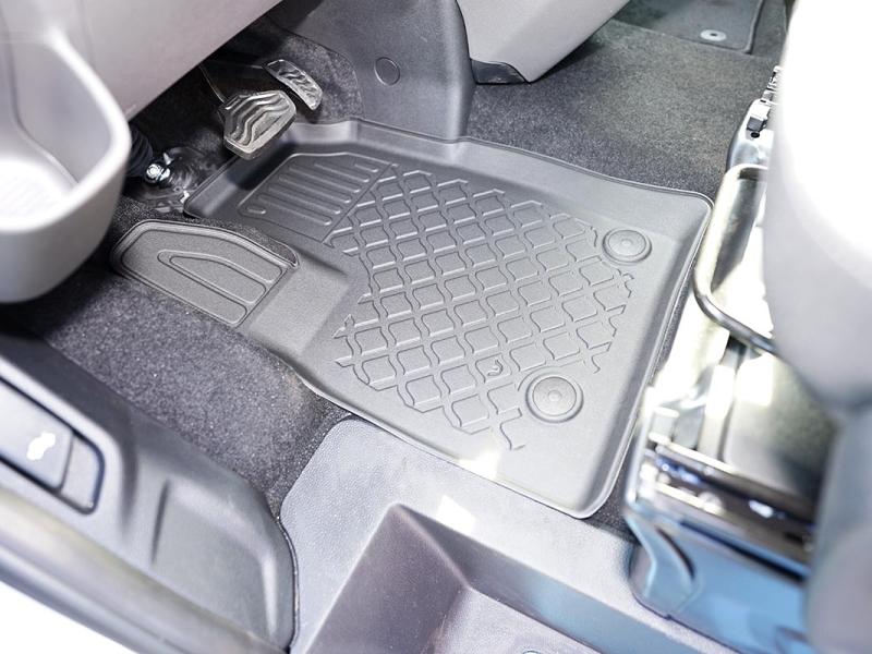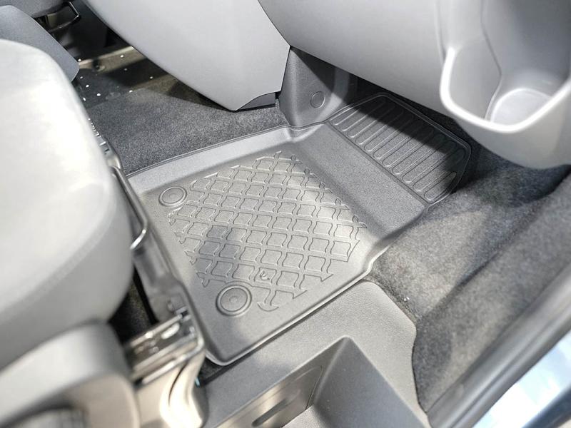 Gumoplastové 3D přesné podlahové koberce ve tvaru vaničky pod nohy pasažérů na vůz Ford Tourneo Custom L1 i L2 automat, Van, 5 dveří, 1.řada sedadel, rok výroby 01.2013 - 06,2023 i po faceliftu od roku výroby 02.2018 ->, od polské firmy Aristar, které zabraňují namočení koberců interiéru od mokrých bot nebo bot od sněhu a jsou vyrobené ze stejného materiálu jako vany do kufru od stejnojmenné firmy.