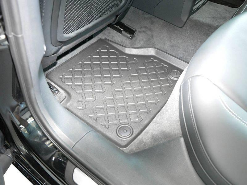 Gumoplastové 3D přesné podlahové koberce ve tvaru vaničky pod nohy pasažérů na vůz Audi A7 (C8) Sportback coupe, od roku výroby 02.2018 ->, od polské firmy Aristar, které zabraňují namočení koberců interiéru od mokrých bot nebo bot od sněhu a jsou vyrobené ze stejného materiálu jako vany do kufru od stejnojmenné firmy.