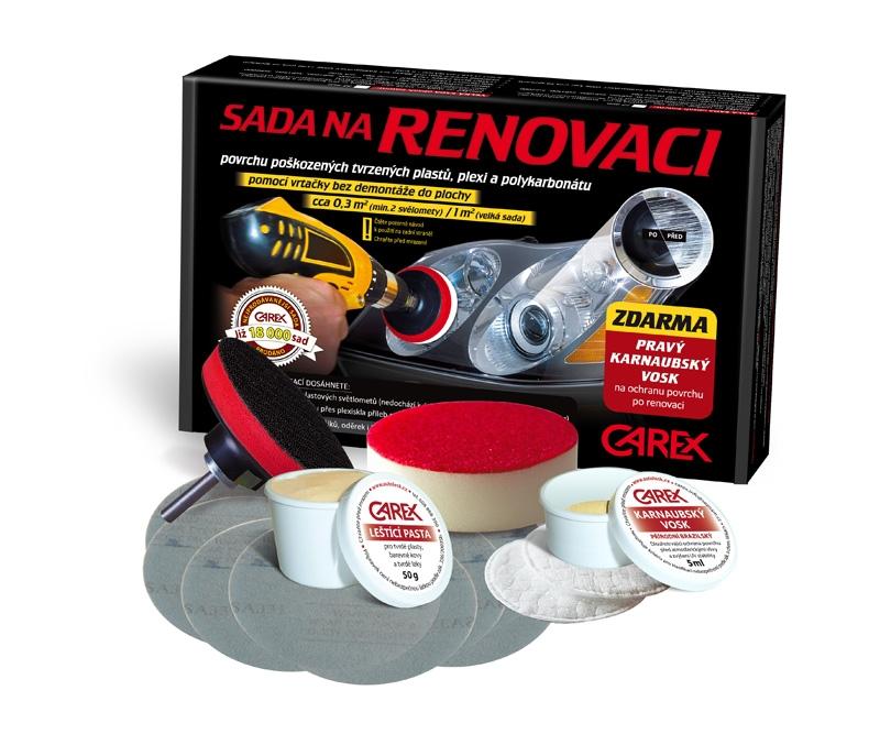 1. Sady na renovaci povrchu světlometů, vč. sad CAREX – tento typ sad určen výhradně pro práci pomocí leštičky nebo vrtačky, by měl splňovat schopnost odstranit broušením z renovovaného povrchu světlometů poškozenou vrstvu (dírky z odlétávajících kamínků, zoxidovanou nebo naleptanou vrstvu, znehodnocenou např. přeleštěním pastou určenou pro autolak či jinými rozpouštědly, dále zašlý krycí lak světlometů, ať už zmatnělý, popraskaný nebo zežloutlý, rýhy po menší havárii, kdy není kryt světlometu prasklý skrz, apod.). Následným postupným broušením jemnějšími zrnitostmi kotoučů se povrch připraví na finální zaleštění a znovu zprůhlednění. Je-li v sadě pasta, určená pro leštění plastů mechanickou cestou (nikoli chemickou), je nutné také leštění provést strojně, např. vrtačkou, přiloženým leštícím kotoučem. Ručně by bylo leštění zdlouhavé, až nemožné.