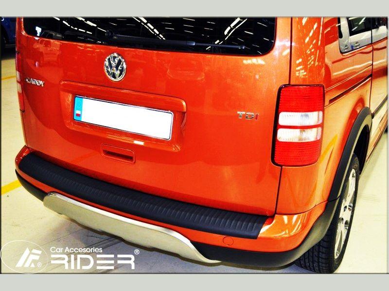 Ochranná černá krycí lišta zadního nárazníku od výrobce RIDER pro vůz Volkswagen Caddy III po faceliftu, roku výroby 2010 - 2015, o přibližném rozměru 1325 x 136 mm.