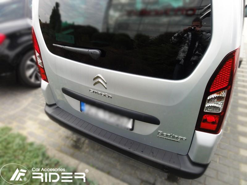 Ochranná černá krycí lišta zadního nárazníku od výrobce RIDER pro vůz Citroen Berlingo II, rok výroby 2008 - 2018, o přibližném rozměru 1318 x 160 mm.