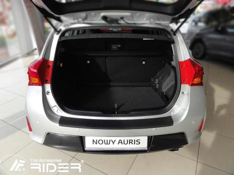 Ochranná černá krycí lišta zadního nárazníku od výrobce RIDER pro vůz Tayota Auris II, rok výroby 2012 - 2014, o přibližném rozměru 912 x 102 mm.
