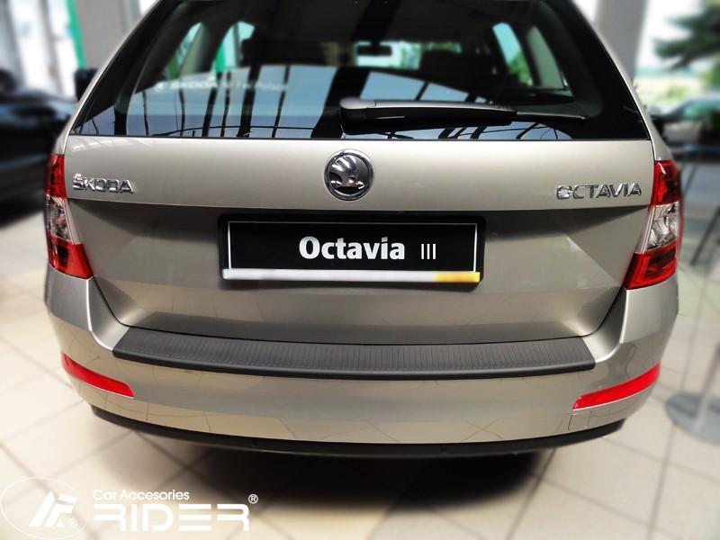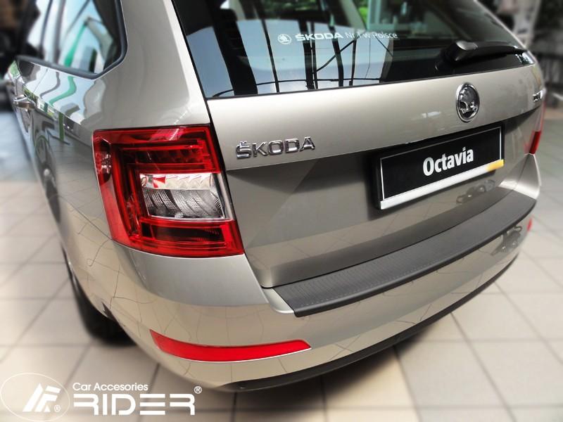 Ochranná černá krycí lišta zadního nárazníku od výrobce RIDER pro vůz Škoda Octavia III combi, rok výroby 2013 - 2016, o přibližném rozměru 1010 x 100 mm.