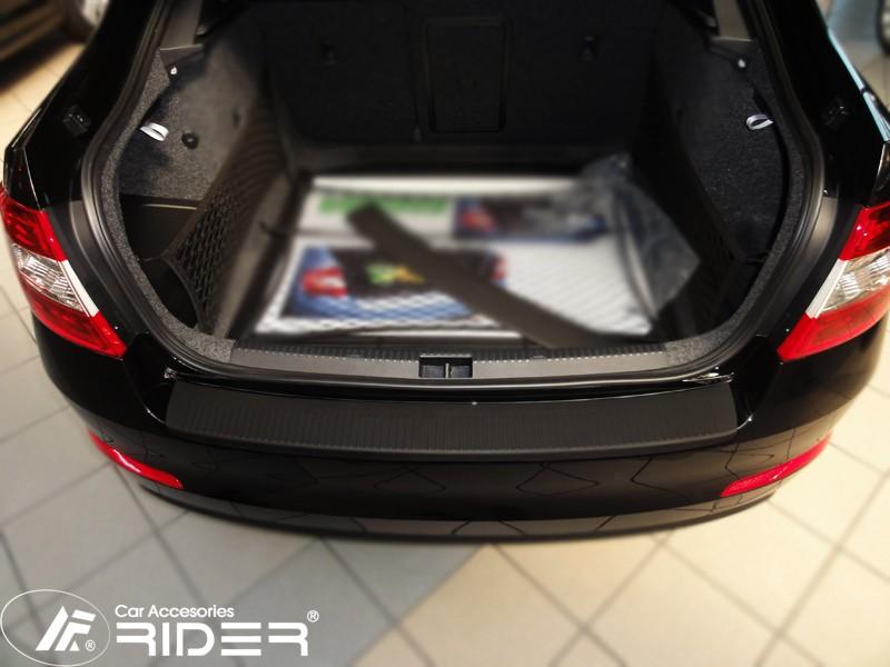 Ochranná černá krycí lišta zadního nárazníku od výrobce RIDER pro vůz Škoda Octavia III sedan, rok výroby 2013 - 2016, o přibližném rozměru 912 x 95 mm.