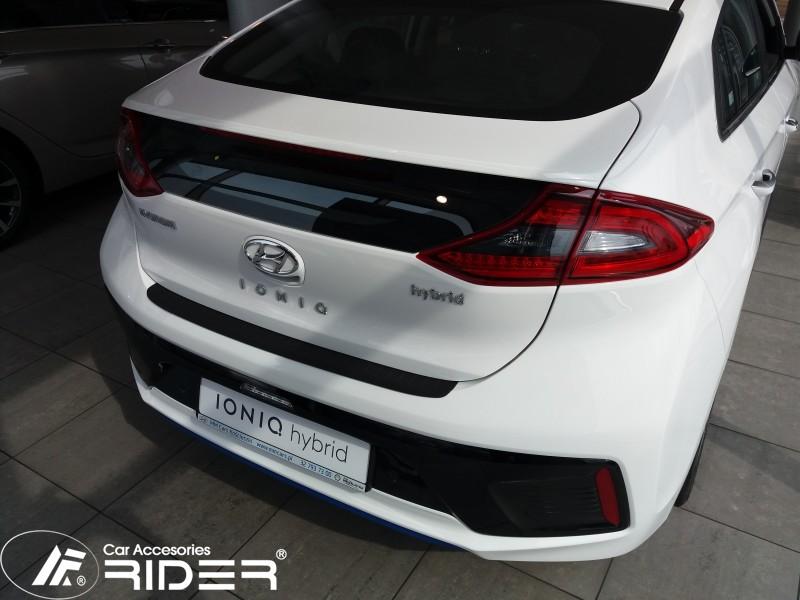 Ochranná černá krycí lišta zadního nárazníku od výrobce RIDER pro vůz Hyundai IONIQ, od roku výroby 2016 ->, o přibližném rozměru 870 x 63 mm.