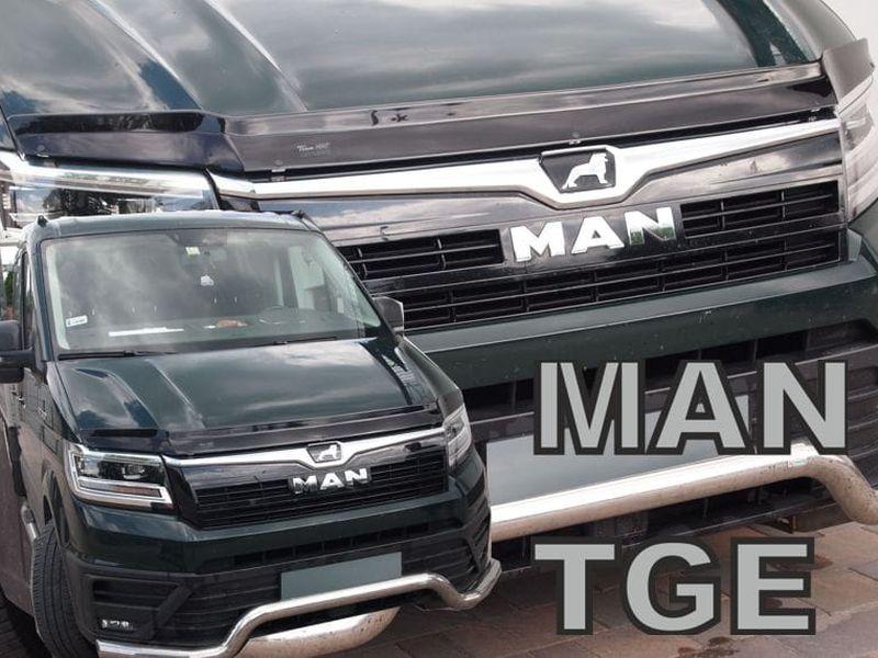 Deflektor přední kapoty motoru na vůz Man TGE, od roku výroby 2017 ->, usměrňuje proudění vzduchu a snižuje znečištění a poškození kapoty a čelního okna od hmyzu, kanímků a podobně, lišta kapoty je vyrobena z kouřového plexiskla firmou HEKO.